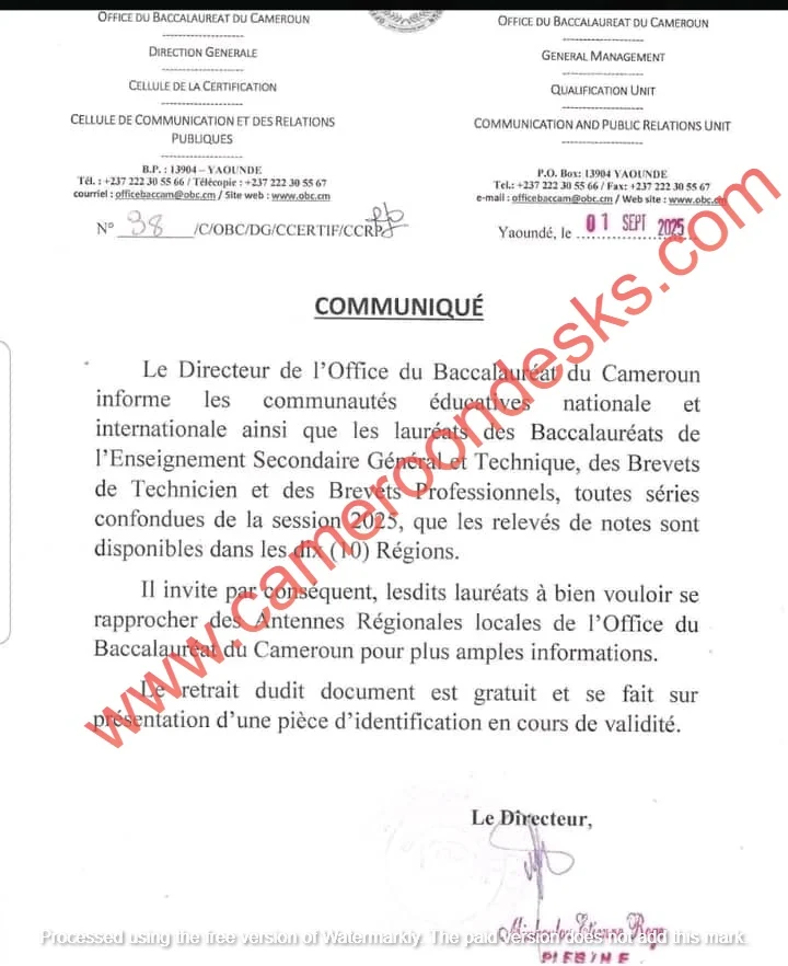 Le Directeur de l’Office du Baccalauréat du Cameroun porte à la connaissance de la communauté éducative ainsi qu’aux lauréats des examens de la session 2025 que les relevés de notes sont désormais disponibles.