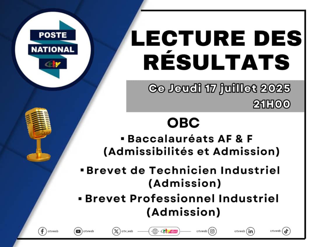 La lecture des résultats définitifs ainsi que des listes d’admissibilité pour les examens du Baccalauréat, du Brevet de Technicien et du Brevet Professionnel Industriel aura lieu ce jeudi à 21h00 sur le Poste National de la CRTV.