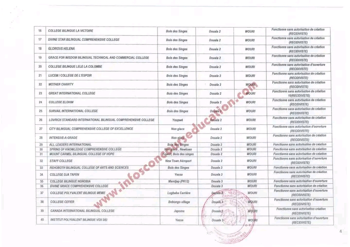 - Violation des formalités légales de création et d’ouverture : plusieurs écoles fonctionnaient sans autorisation officielle ou sans respecter les procédures prévues par la loi en matière d’enseignement privé.