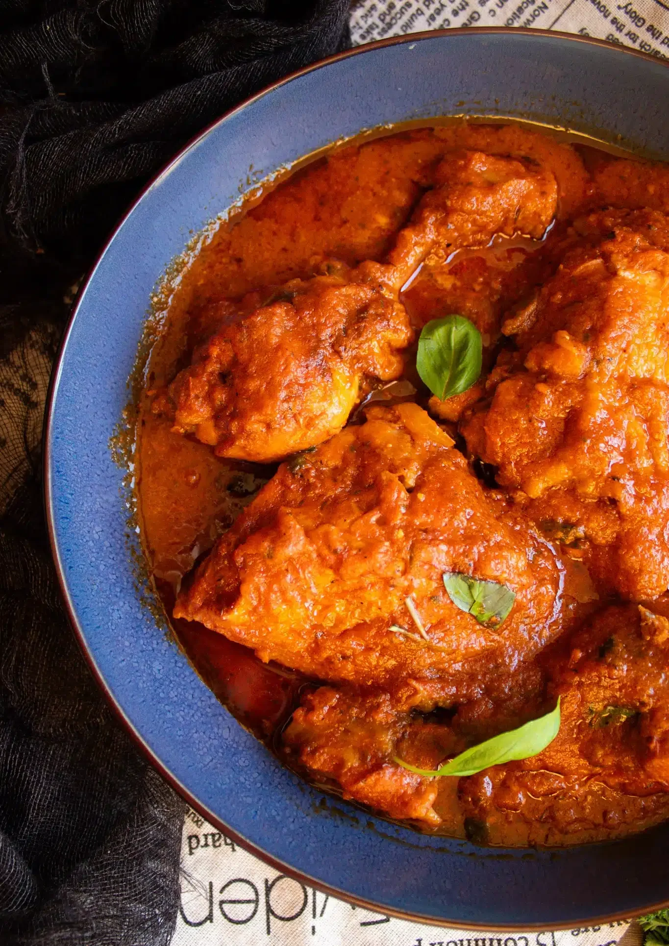- Ajoute le poulet, un peu d’eau, le basilic écrasé et laisse cuire à feu doux jusqu’à ce que l’huile remonte à la surface.