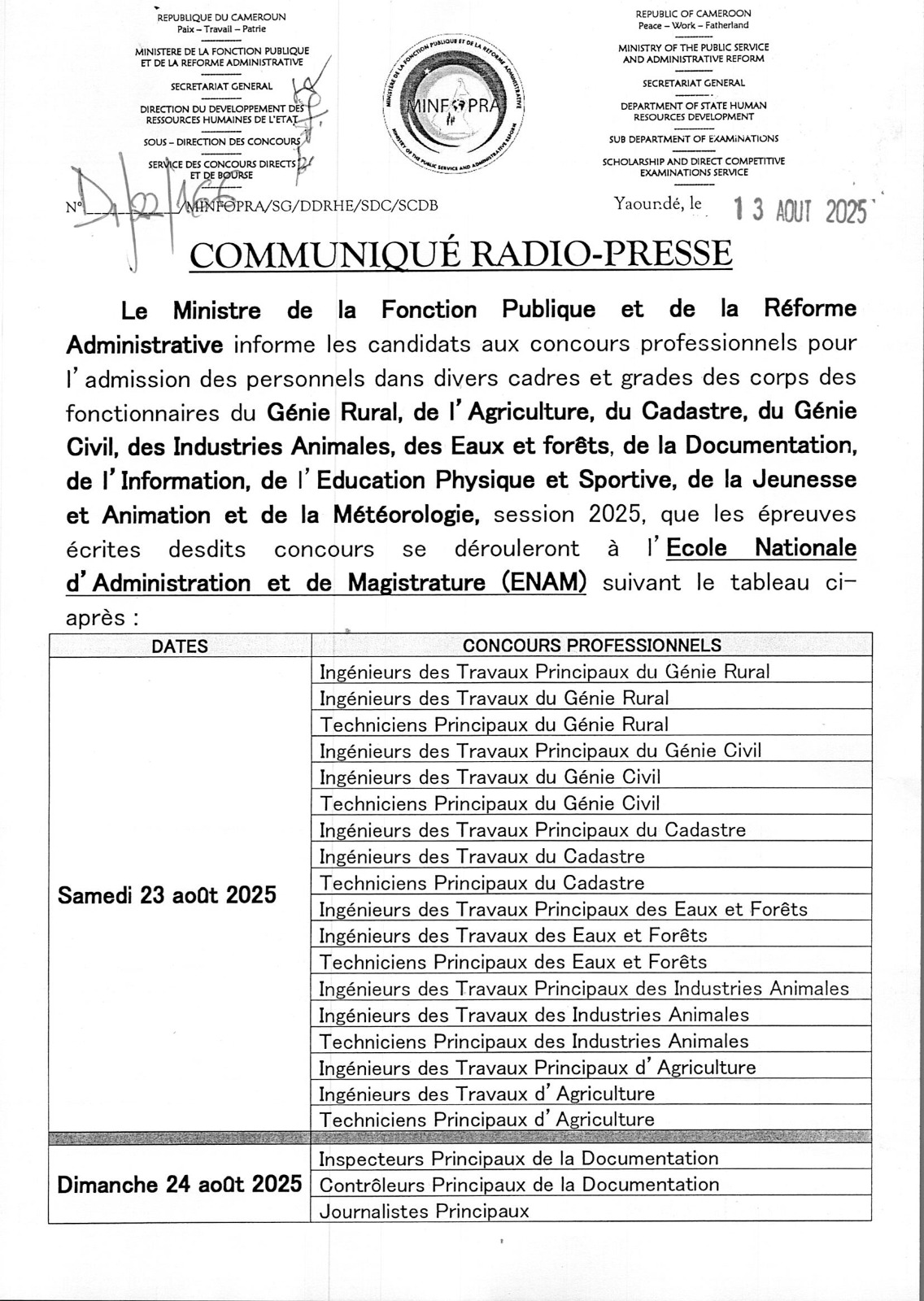Vous qui vous préparez avec diligence pour les concours professionnels prévus les 23 et 24 août 2025, nous avons quelques informations importantes à partager avec vous. Que vous soyez aspirant au sein du Génie Rural, de l’Agriculture, du Cadastre ou encore du Génie Civil, ce message est pour vous !
