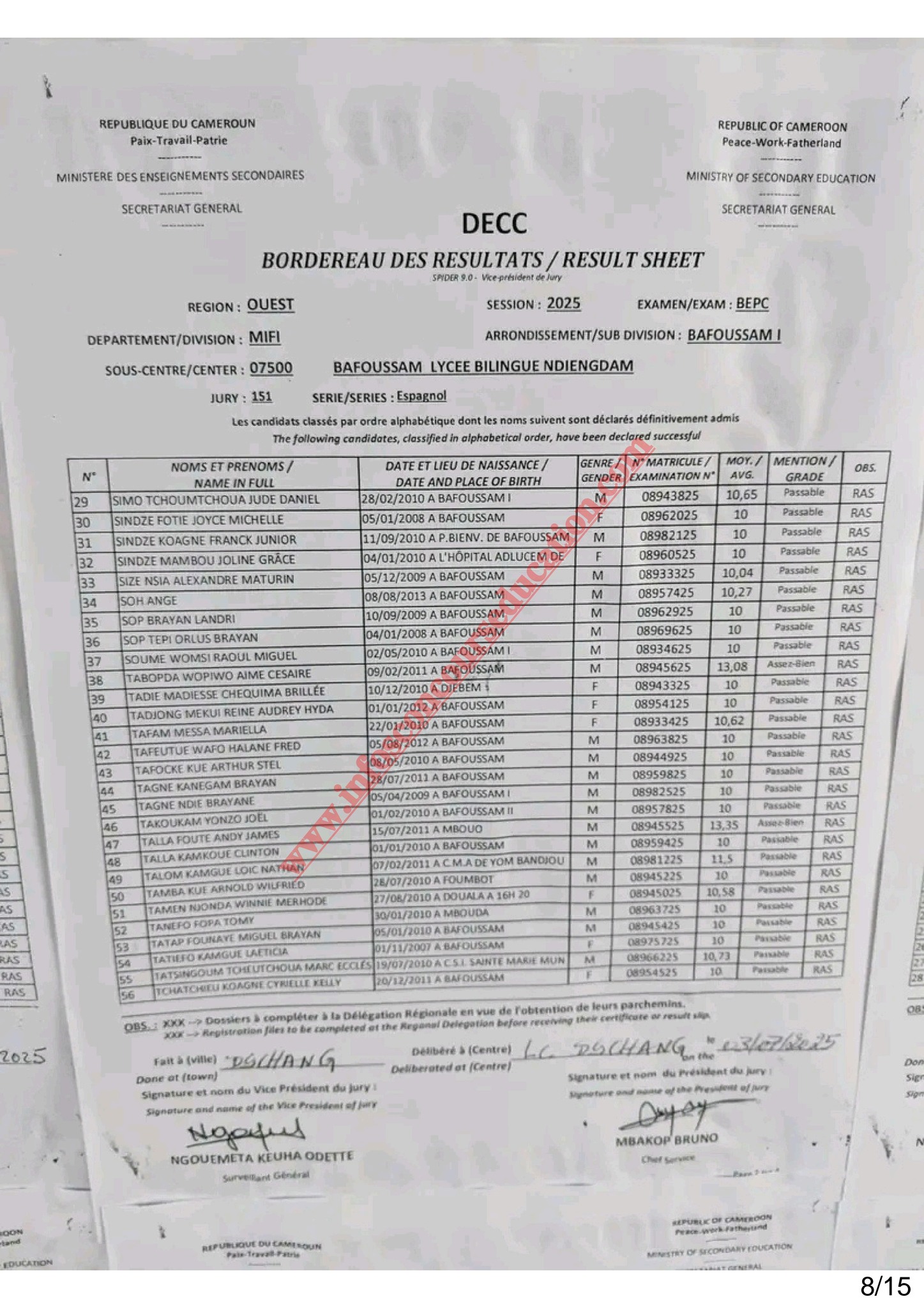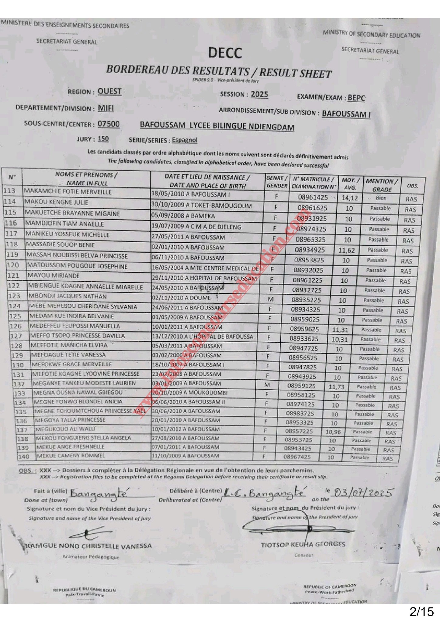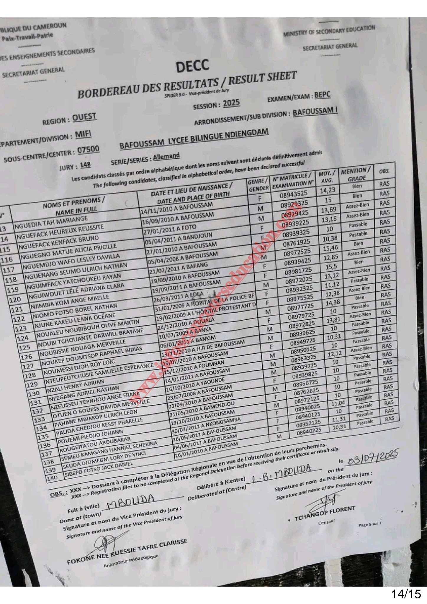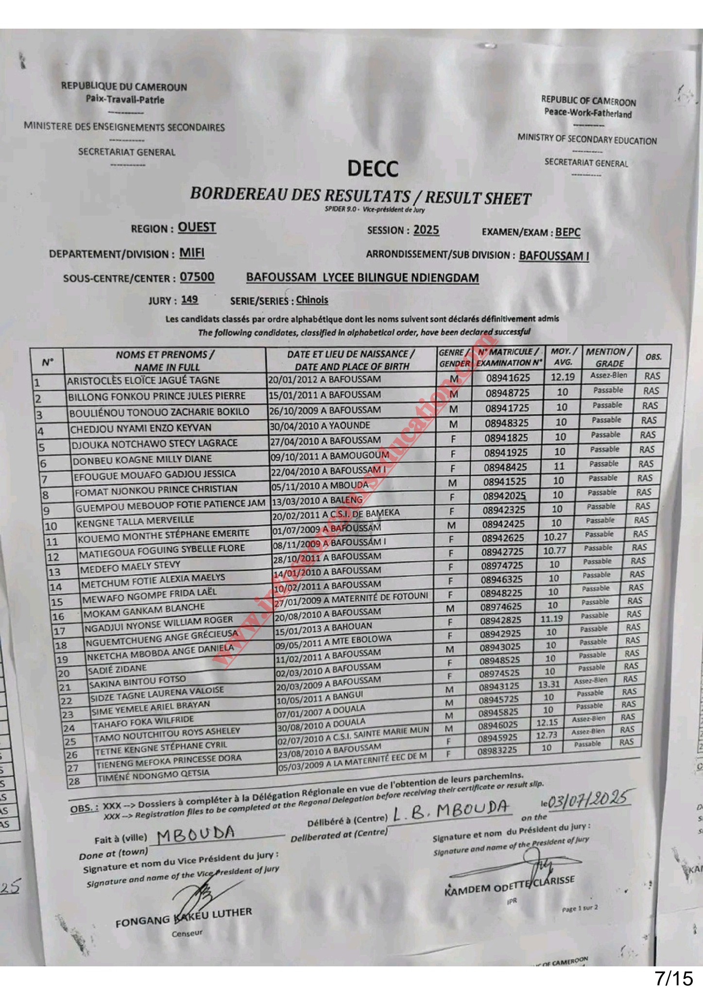 Les résultats du BEPC 2025 pour le sous‑centre du lycée bilingue de Ndiengdam à Bafoussam sont désormais publiés. Les candidats et leurs familles peuvent venir consulter les listes affichées pour découvrir les noms des admis, reflet de la persévérance et de l’investissement de chacun tout au long de l’année scolaire.