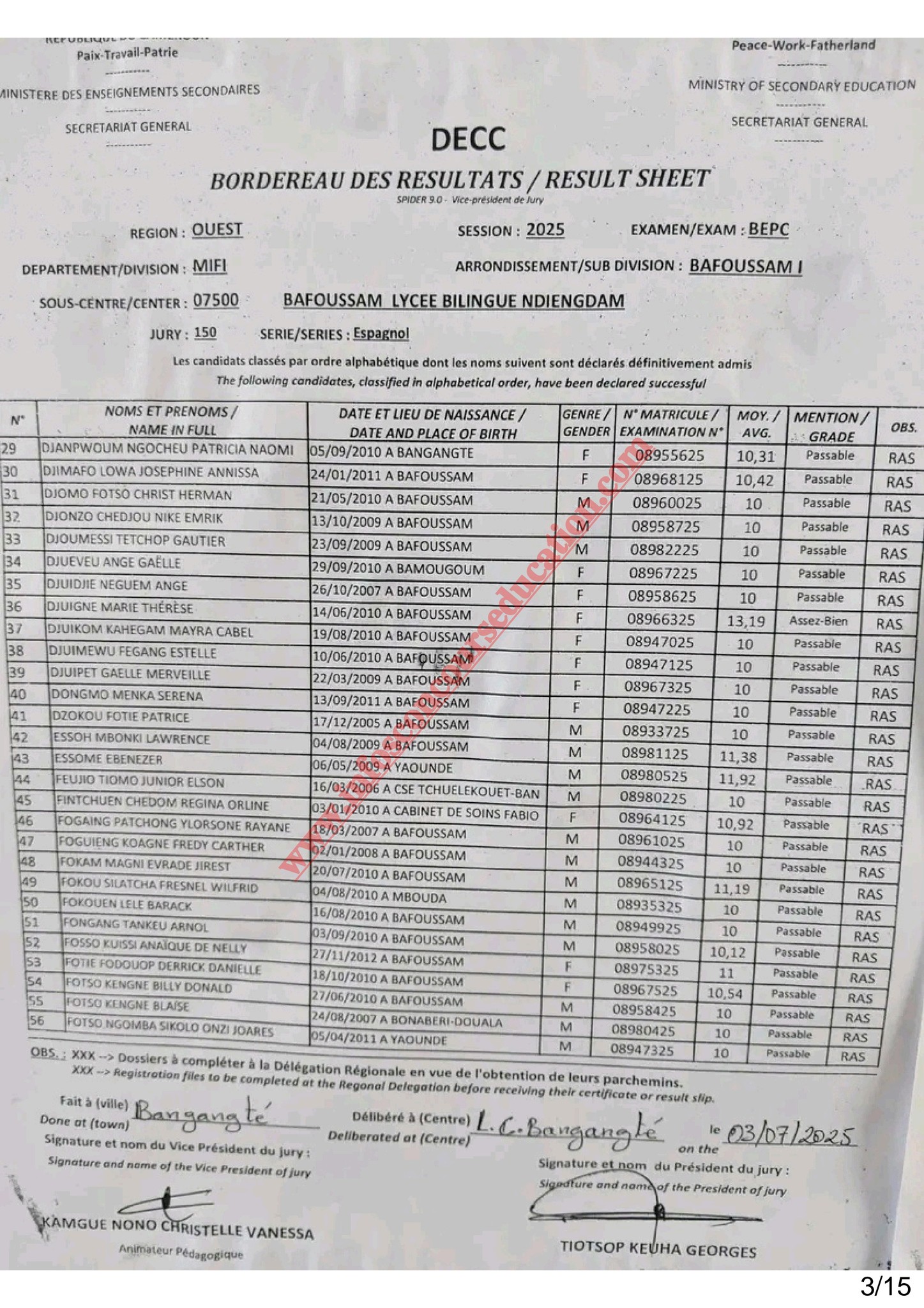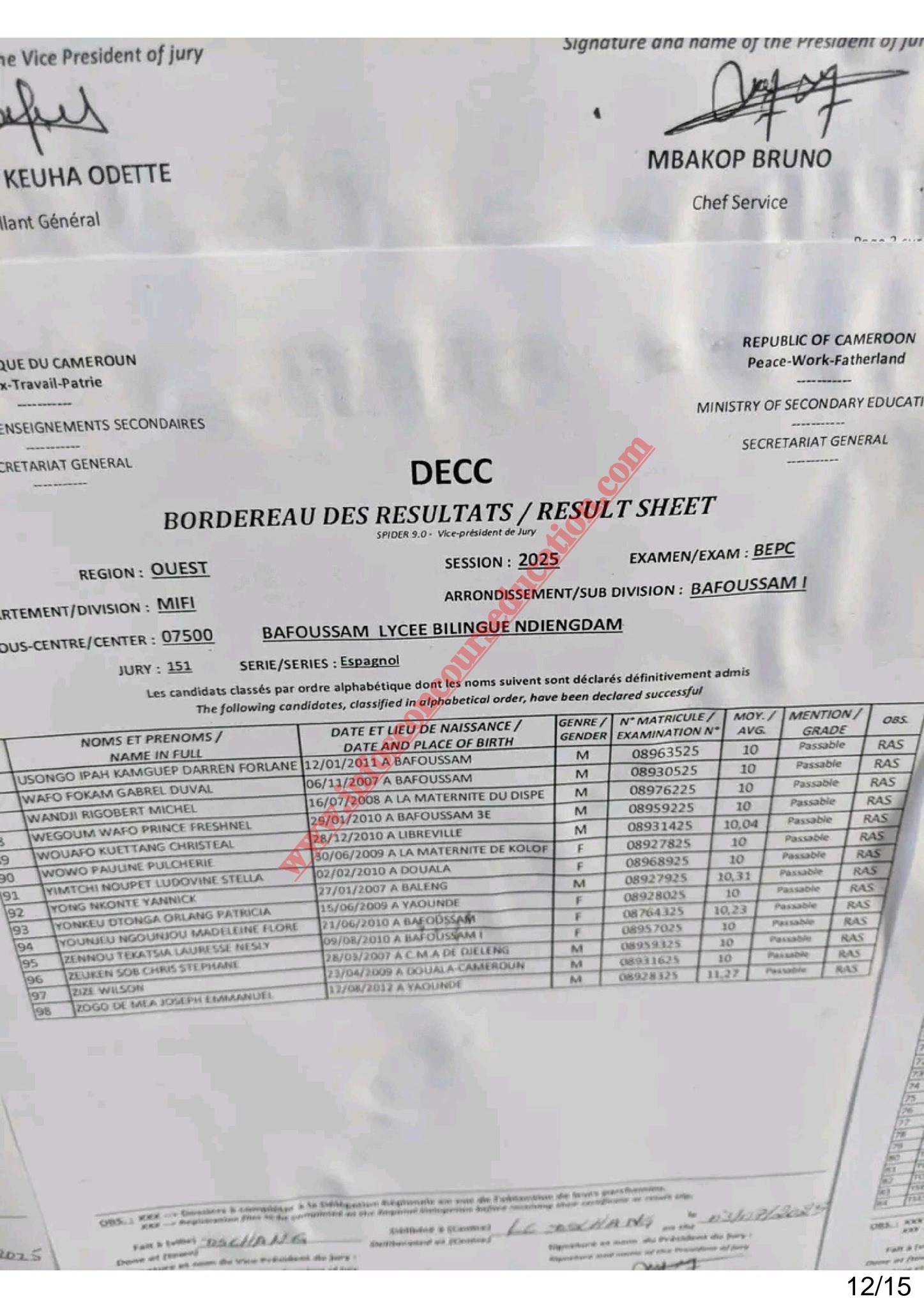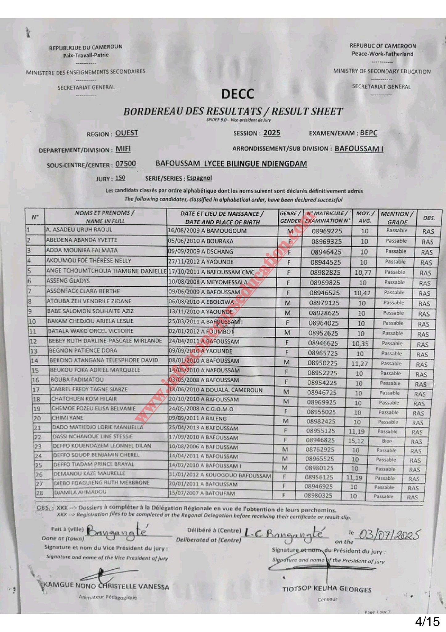 Les résultats du BEPC 2025 pour le sous‑centre du lycée bilingue de Ndiengdam à Bafoussam sont désormais publiés. Les candidats et leurs familles peuvent venir consulter les listes affichées pour découvrir les noms des admis, reflet de la persévérance et de l’investissement de chacun tout au long de l’année scolaire.
