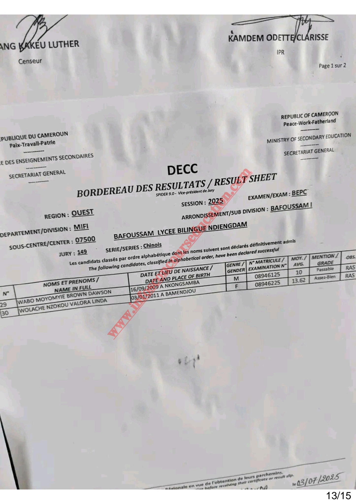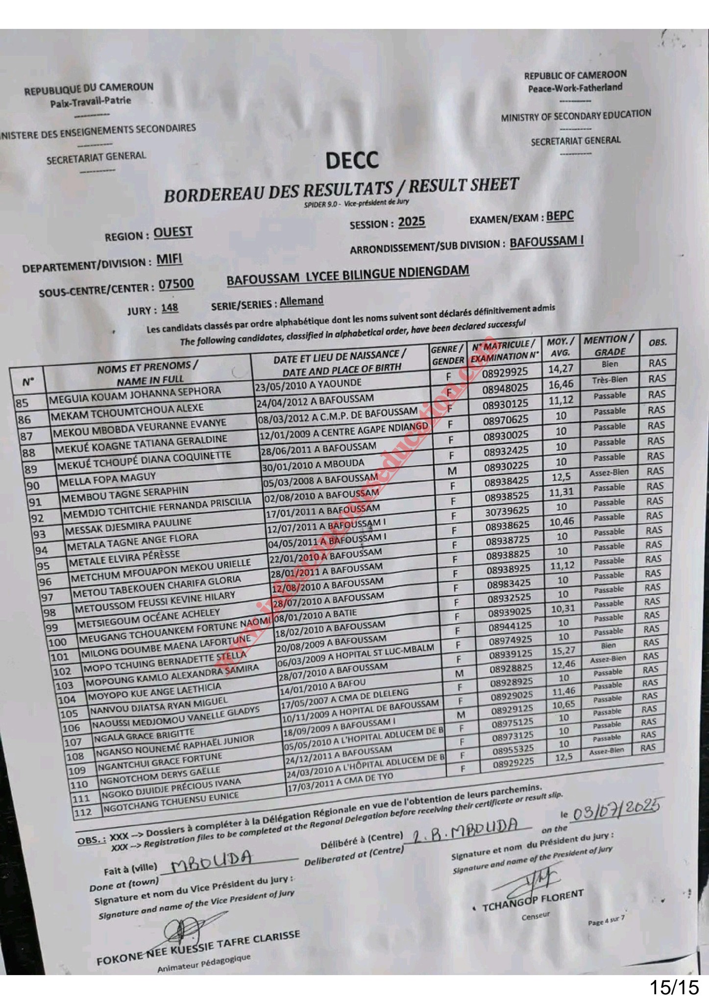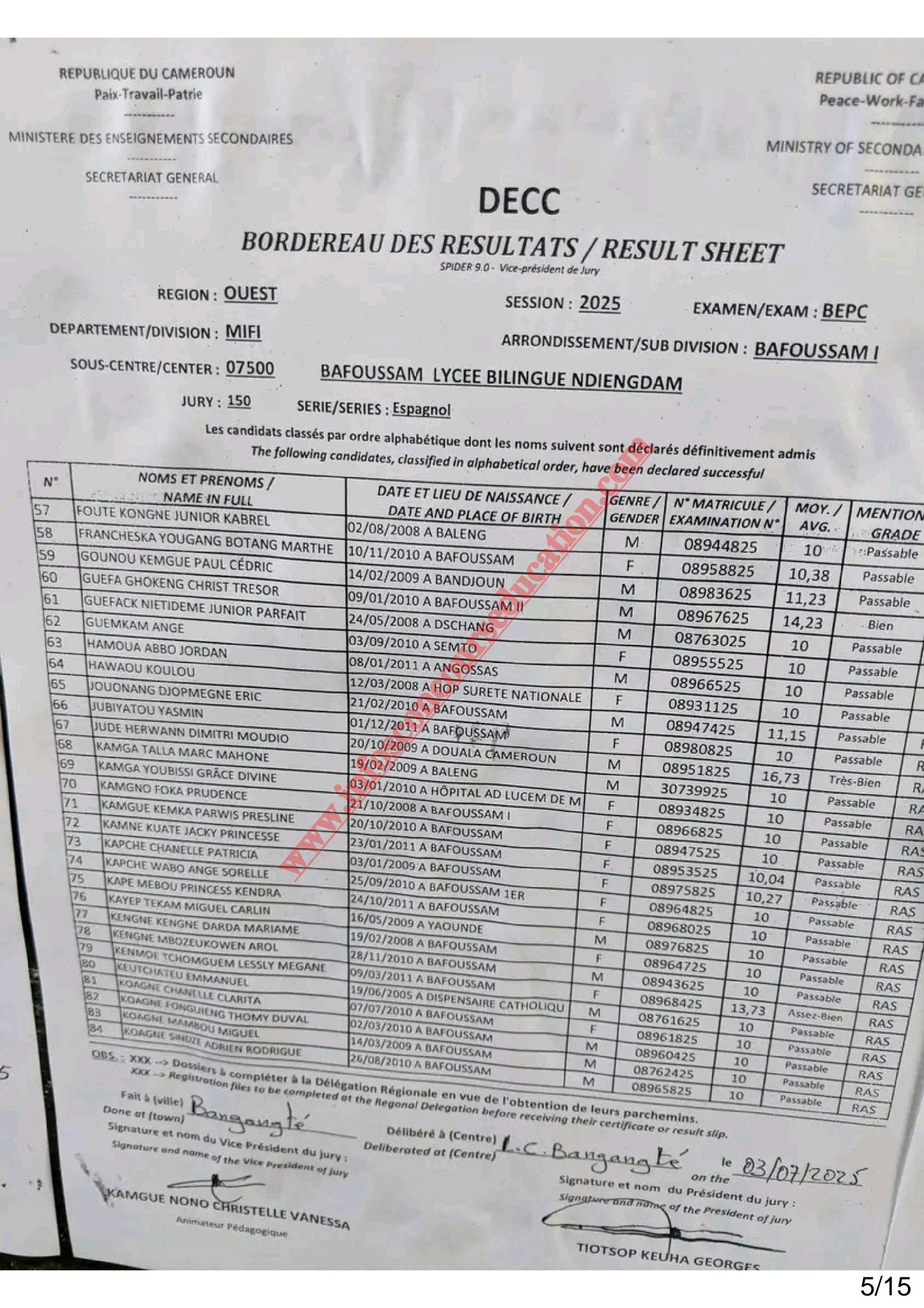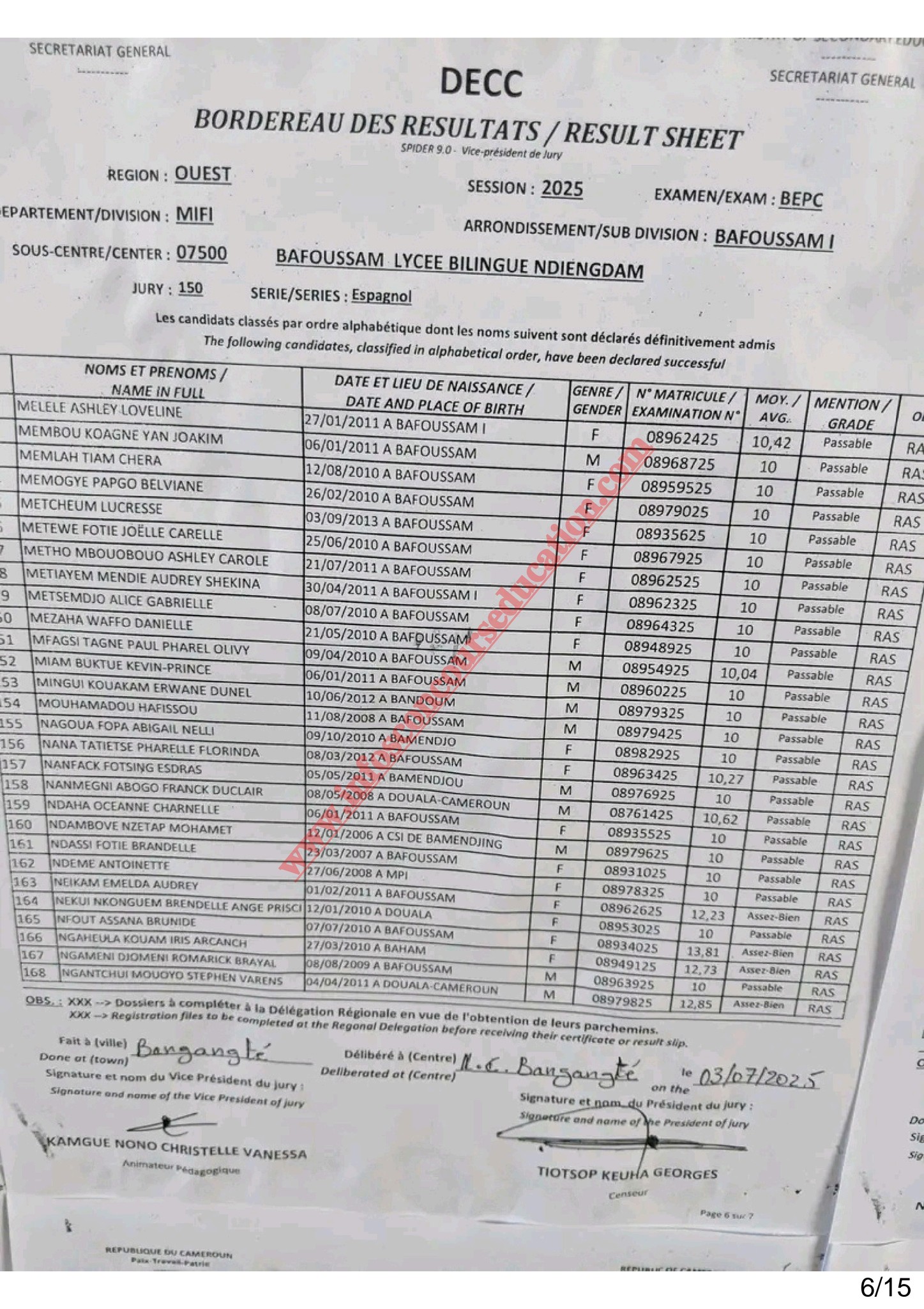 Les résultats du BEPC 2025 pour le sous‑centre du lycée bilingue de Ndiengdam à Bafoussam sont désormais publiés. Les candidats et leurs familles peuvent venir consulter les listes affichées pour découvrir les noms des admis, reflet de la persévérance et de l’investissement de chacun tout au long de l’année scolaire.