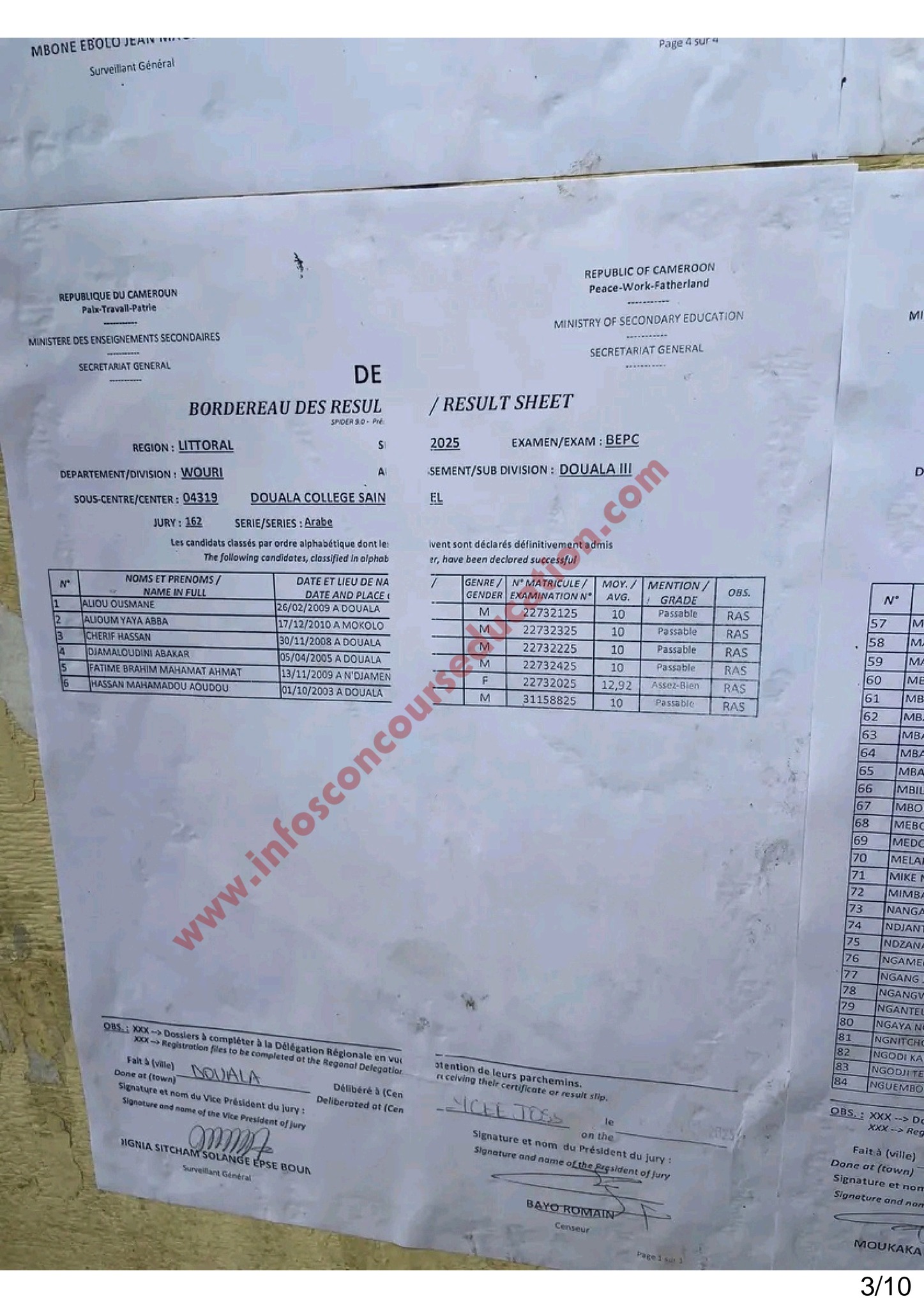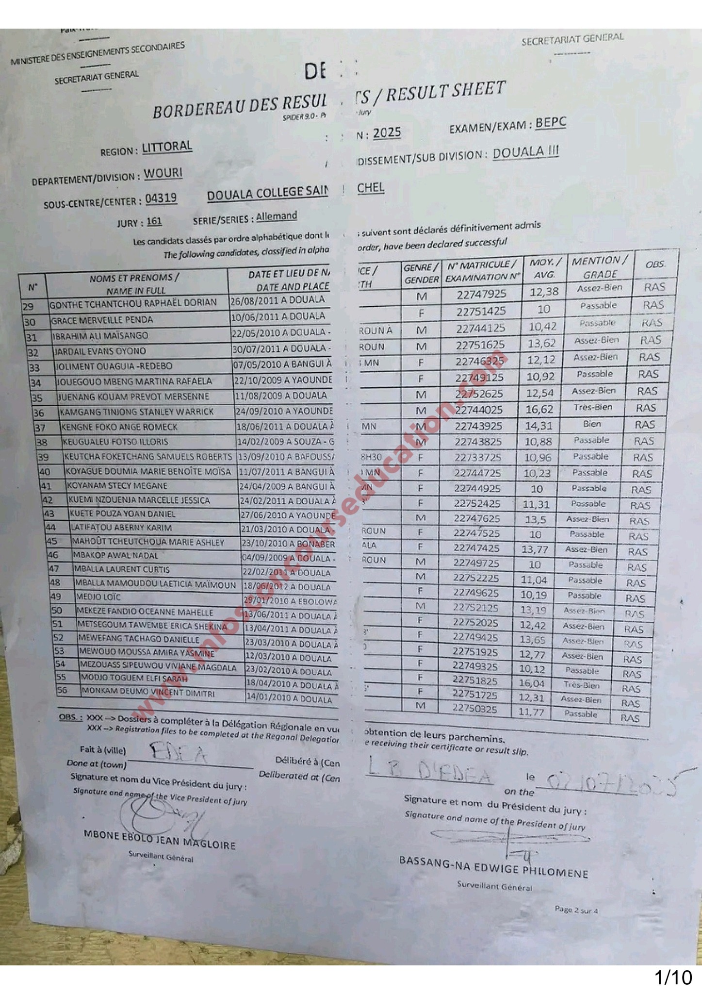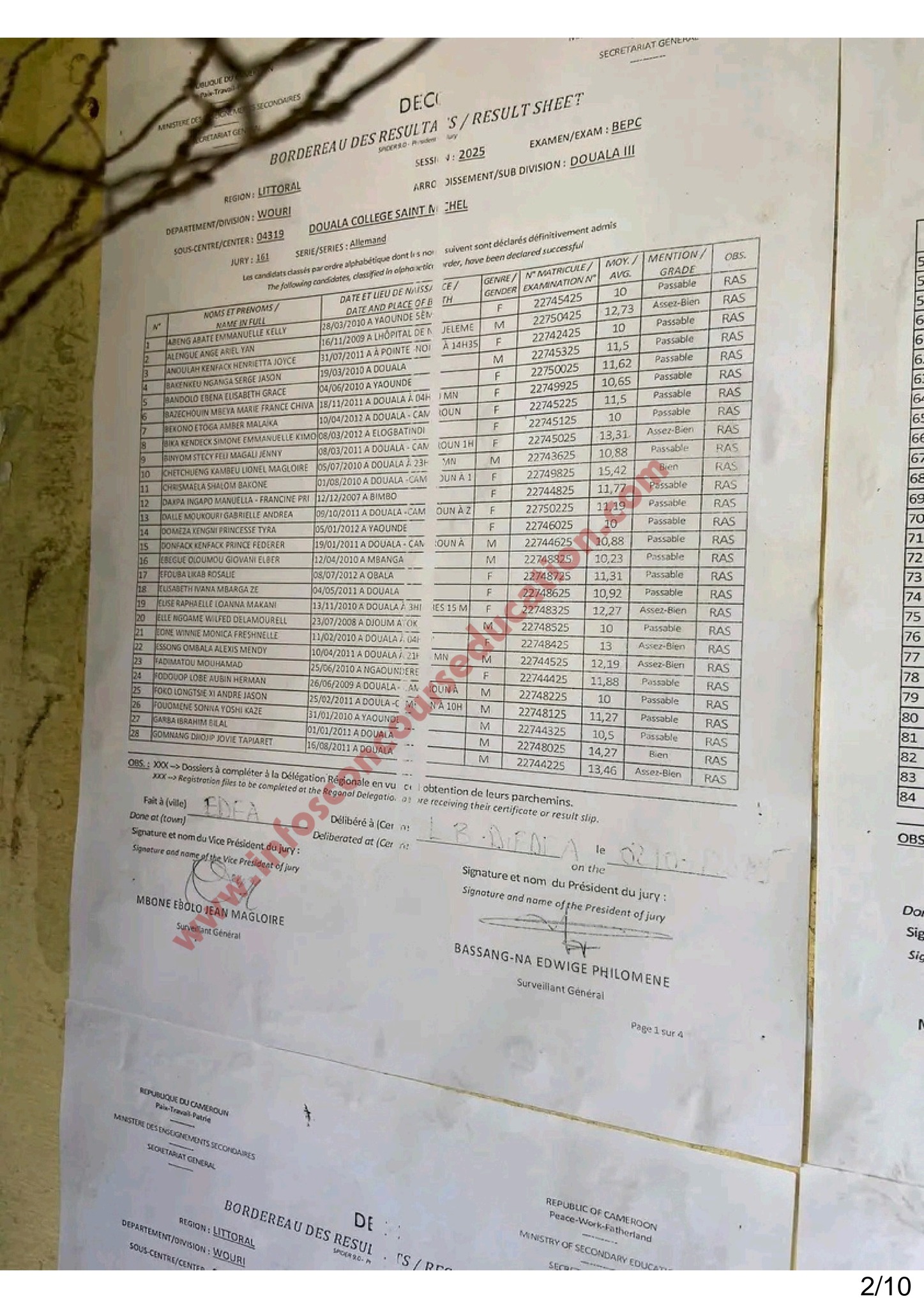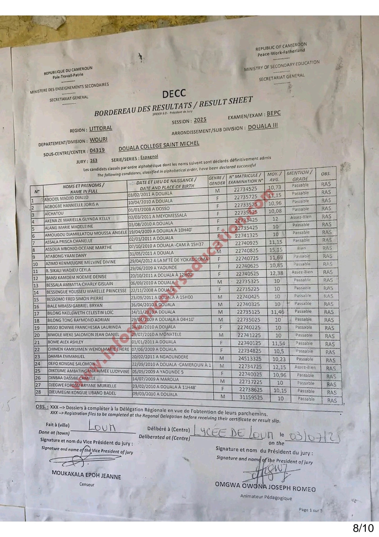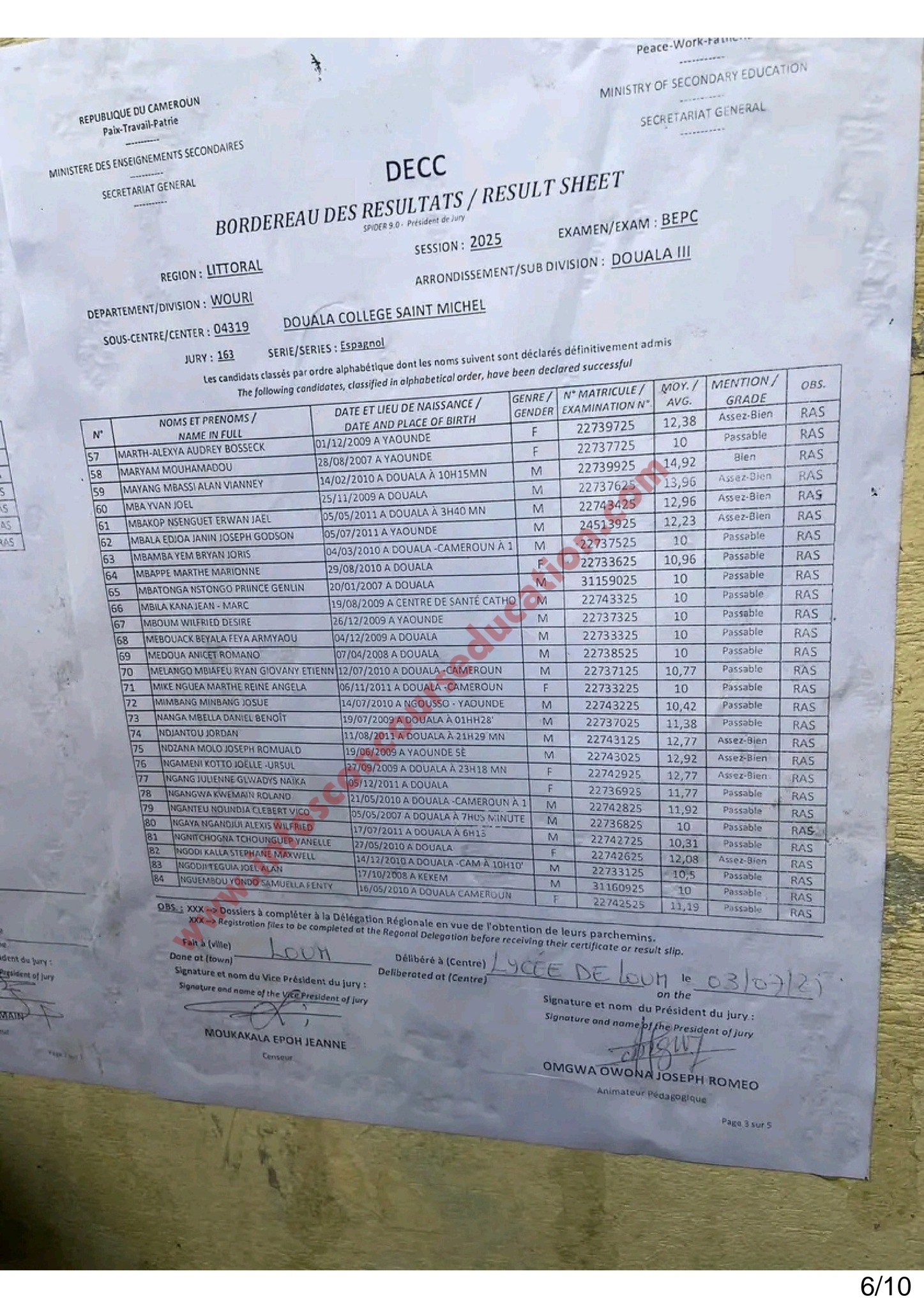 Résultats BEPC 2025 littoral Collège Saint Michel