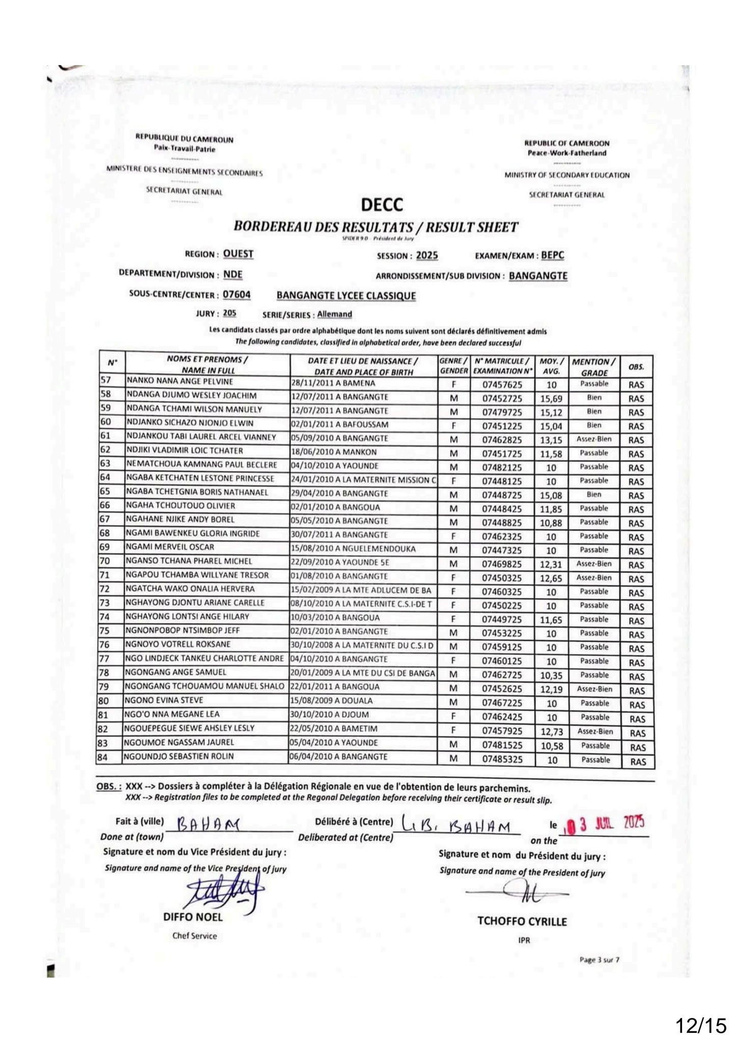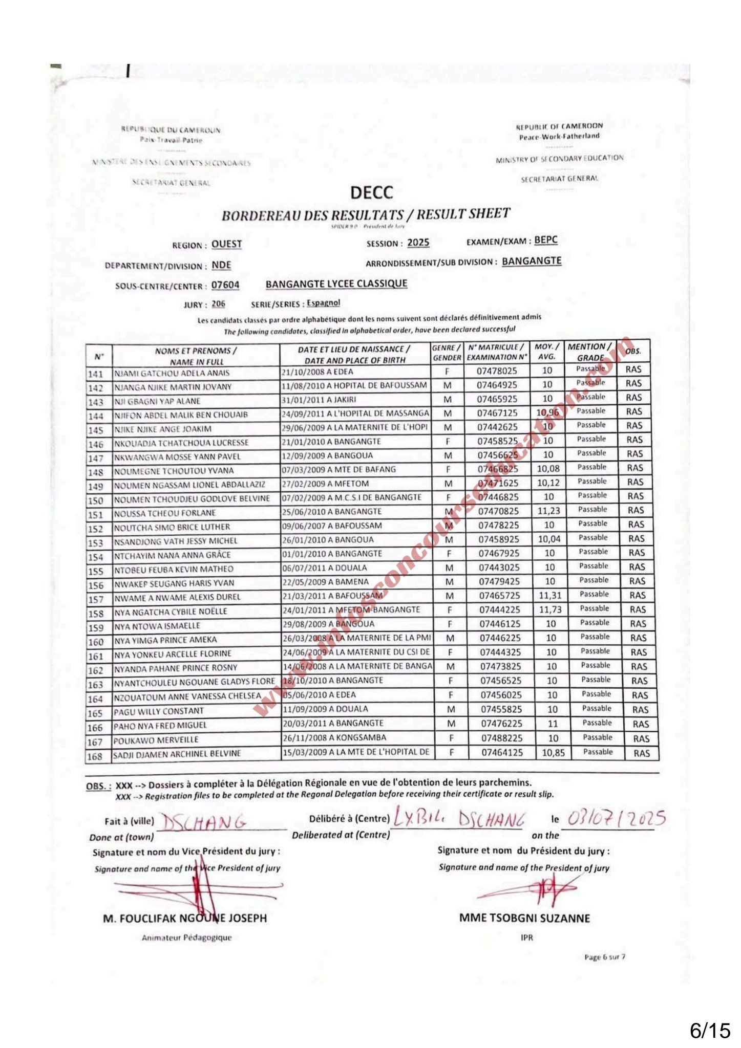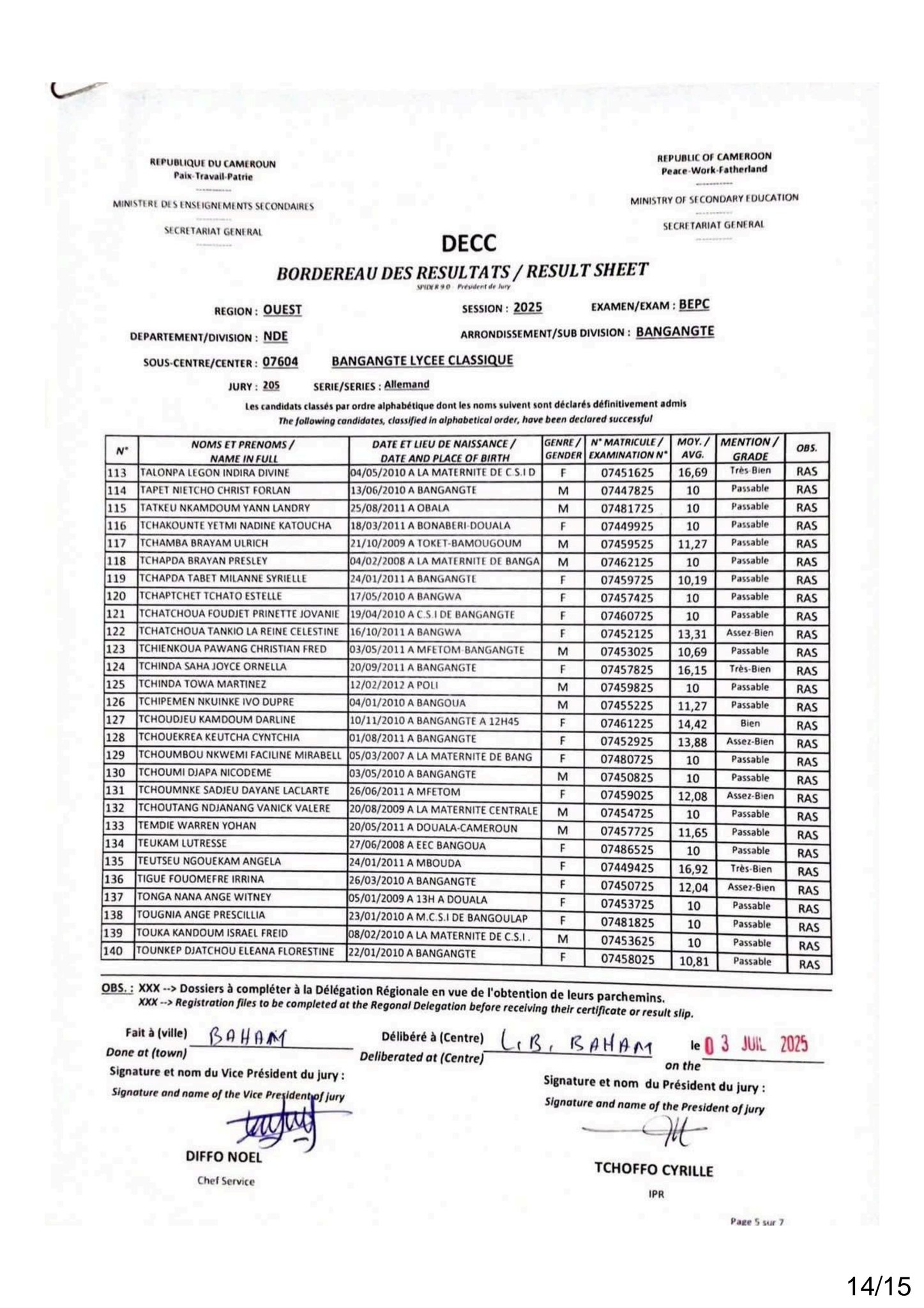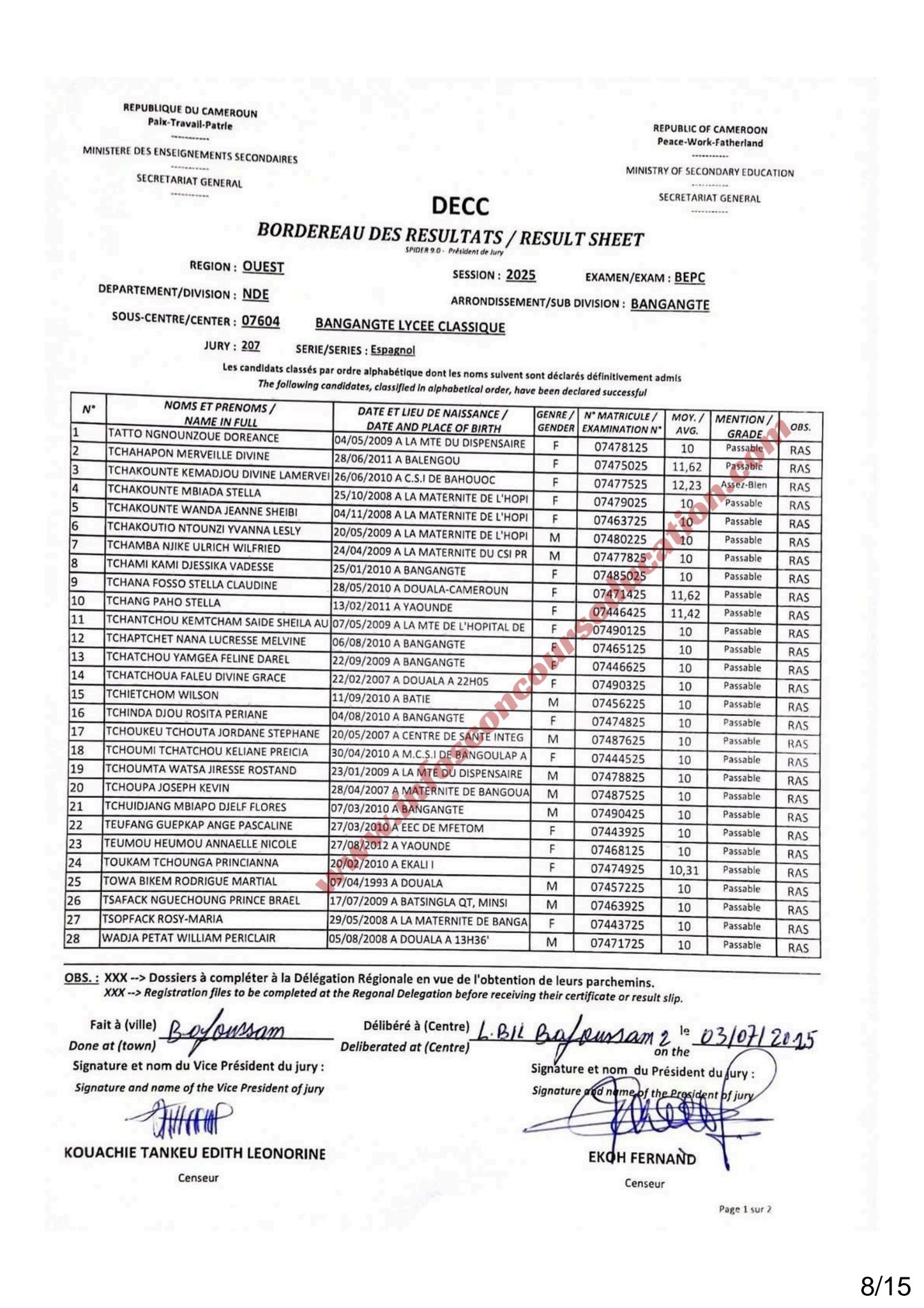 Les résultats du BEPC 2025 pour le lycée classique de Bangangté sont désormais affichés. Les élèves et leurs familles peuvent consulter les listes exposées pour découvrir les noms des admis, reflet de la persévérance et de l’implication de chacun tout au long de l’année scolaire.