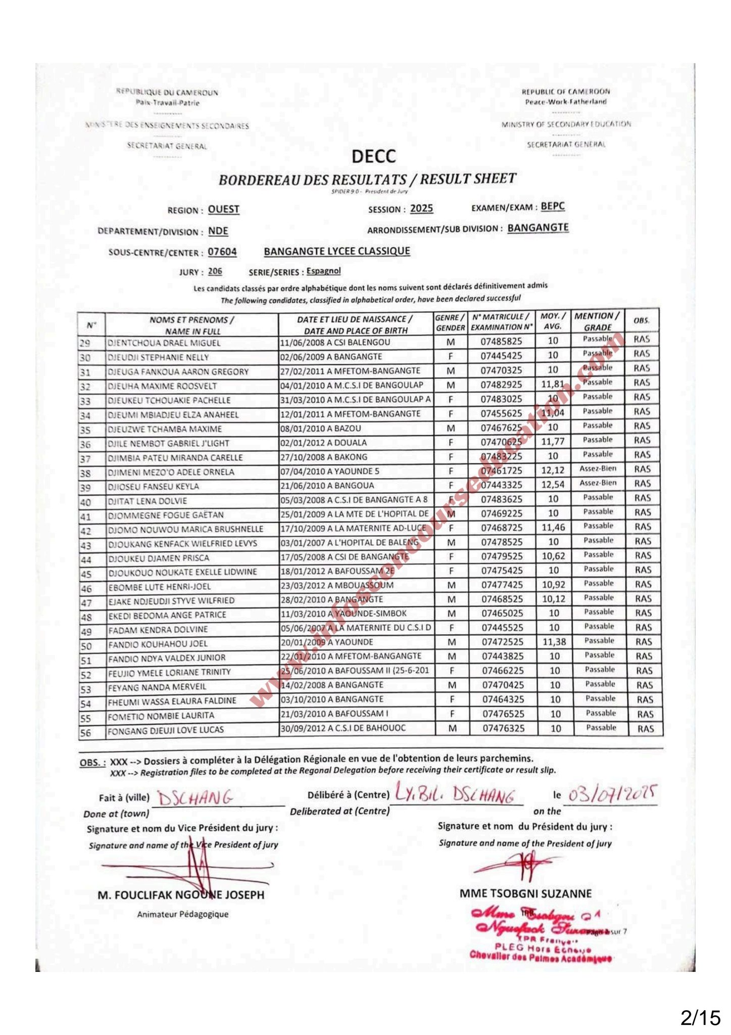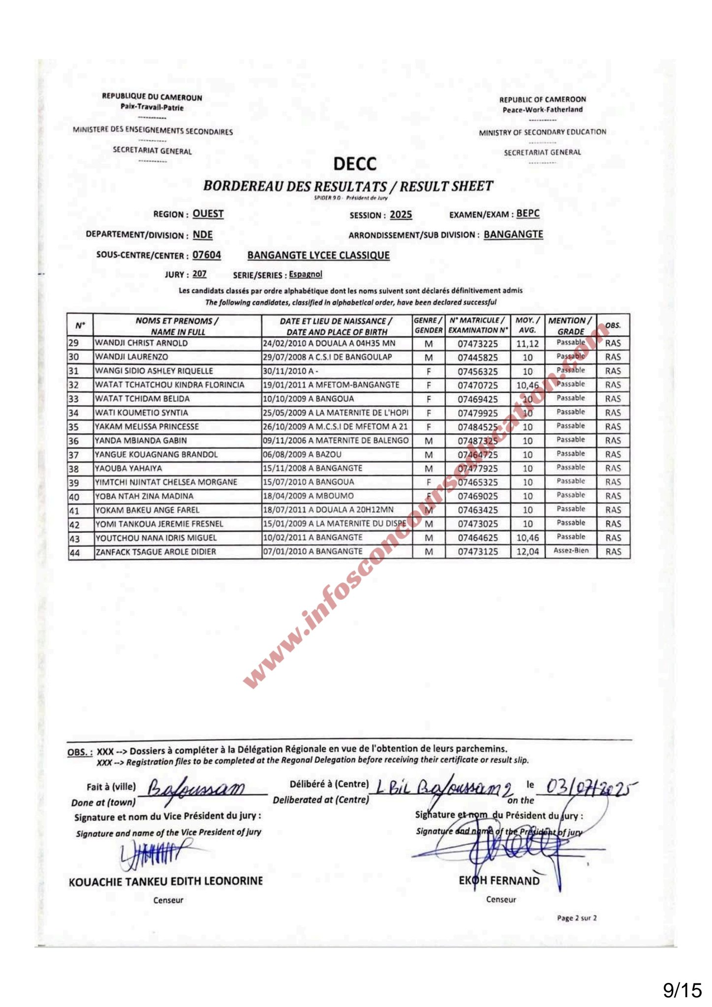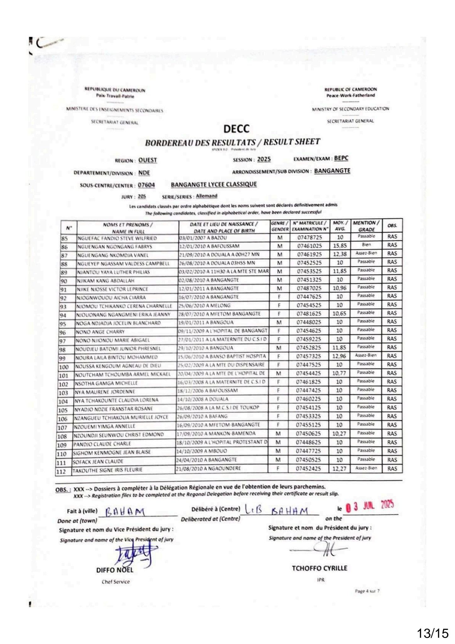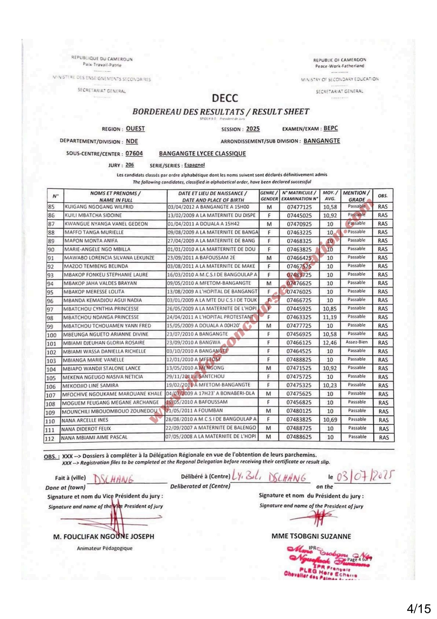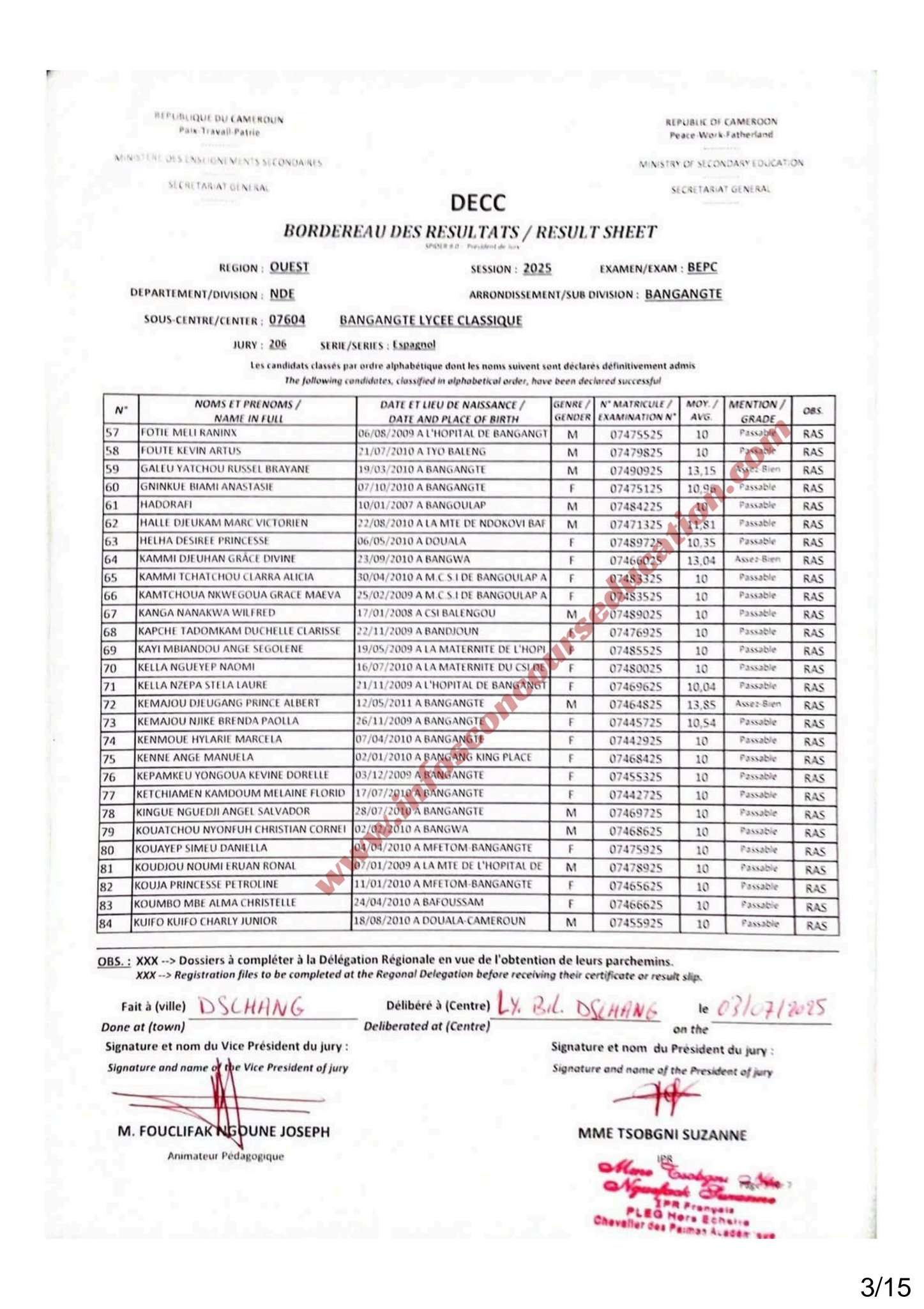 Les résultats du BEPC 2025 pour le lycée classique de Bangangté sont désormais affichés. Les élèves et leurs familles peuvent consulter les listes exposées pour découvrir les noms des admis, reflet de la persévérance et de l’implication de chacun tout au long de l’année scolaire.