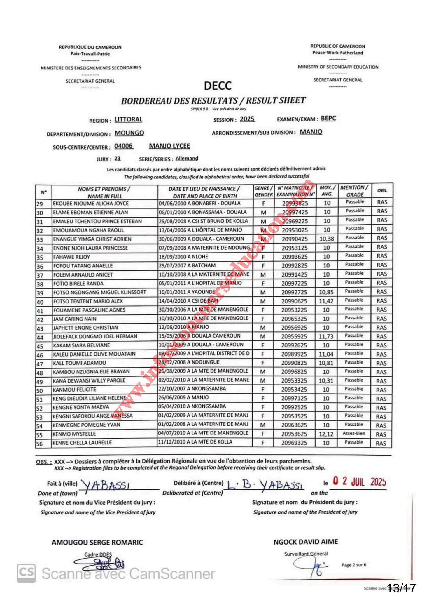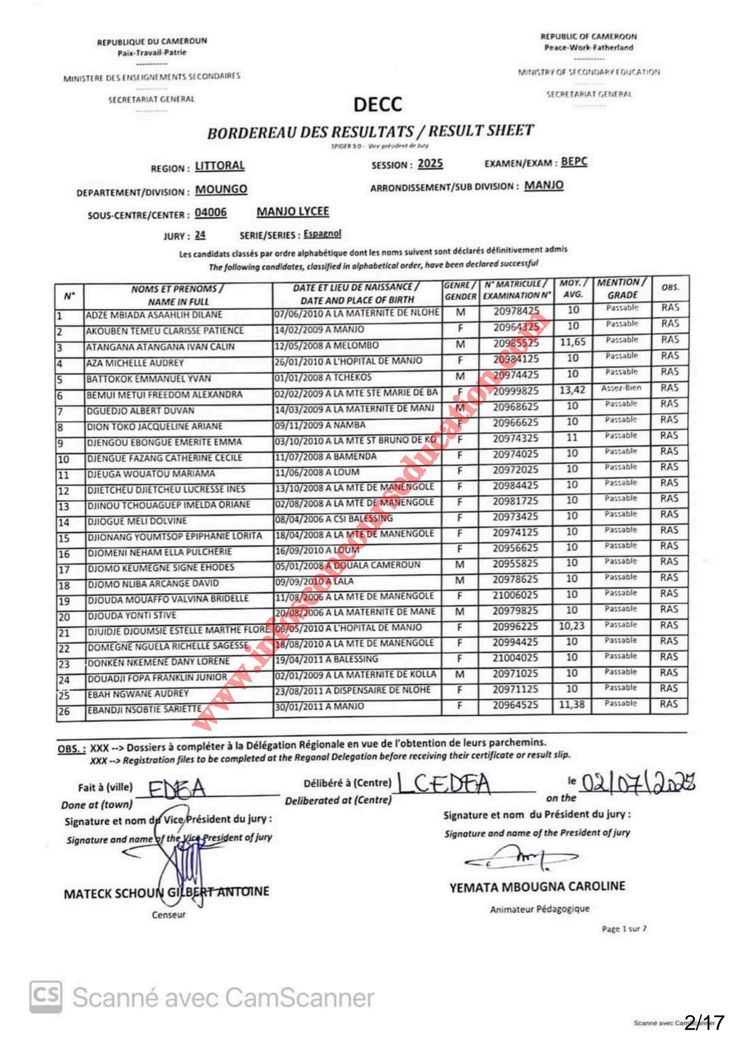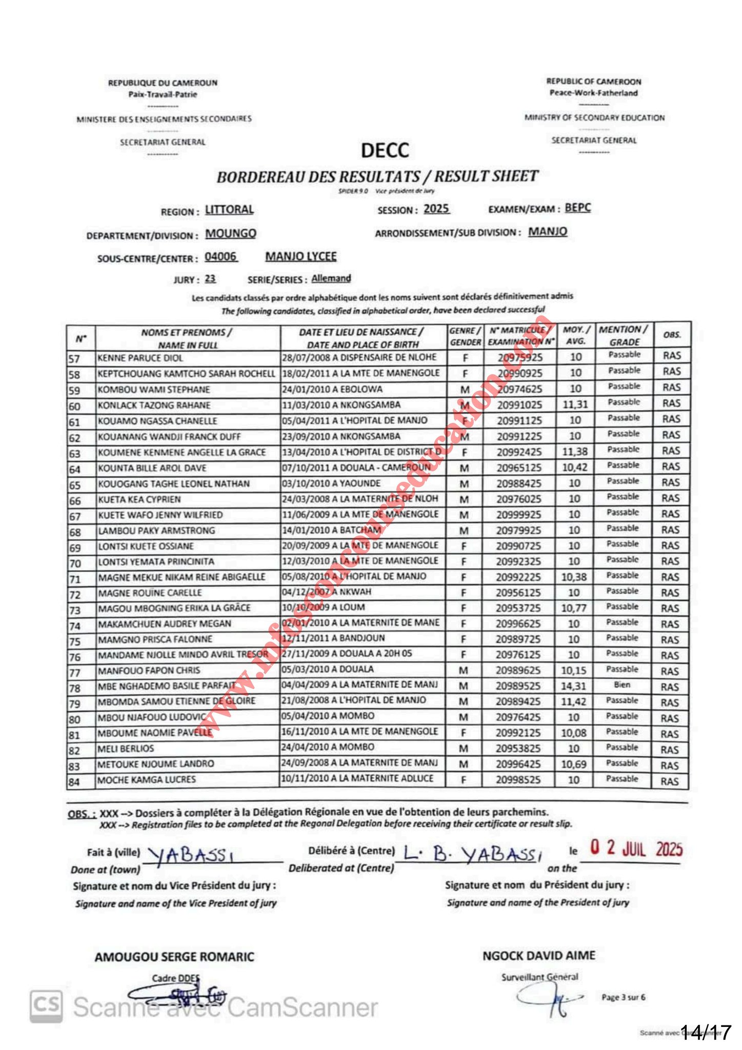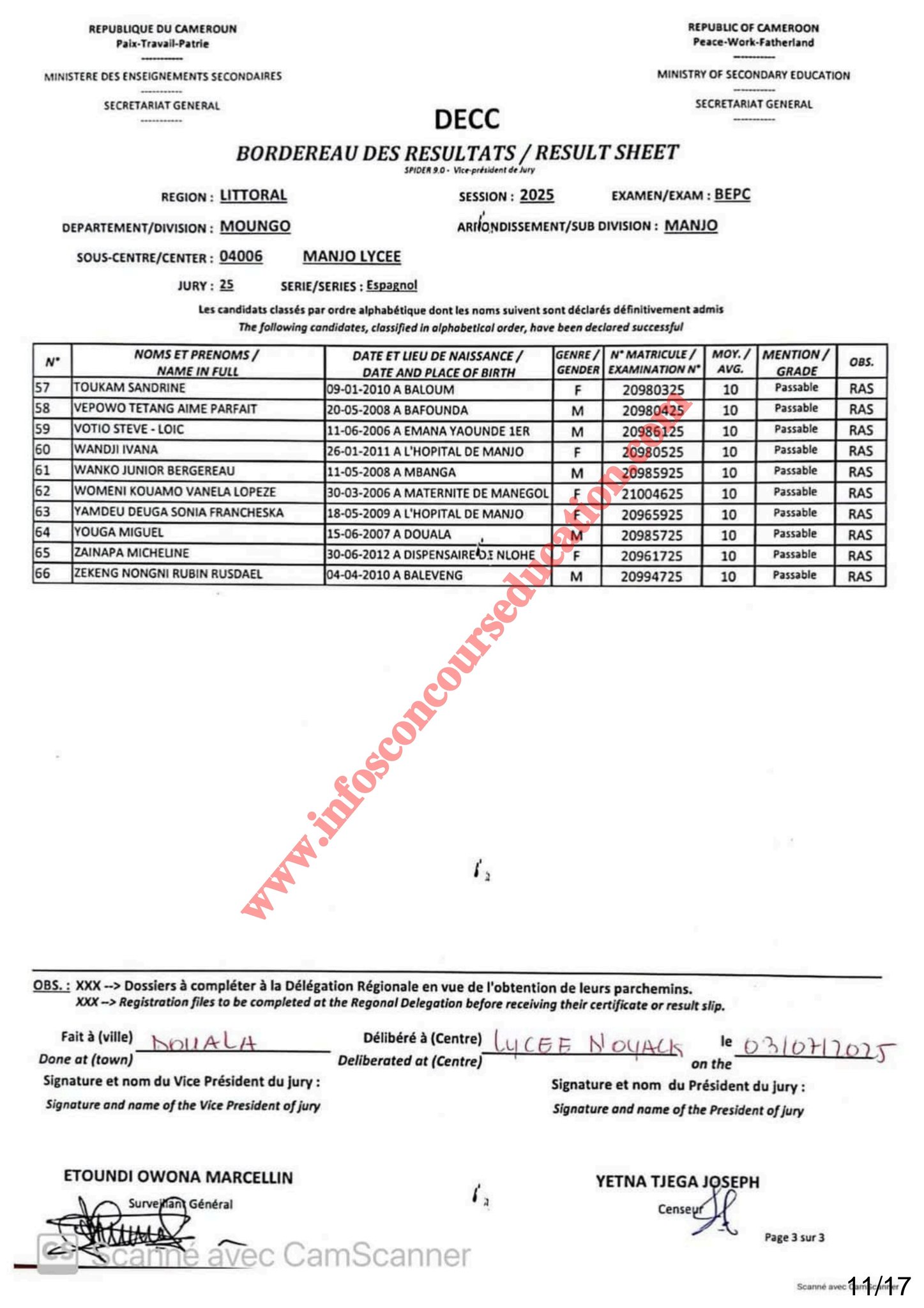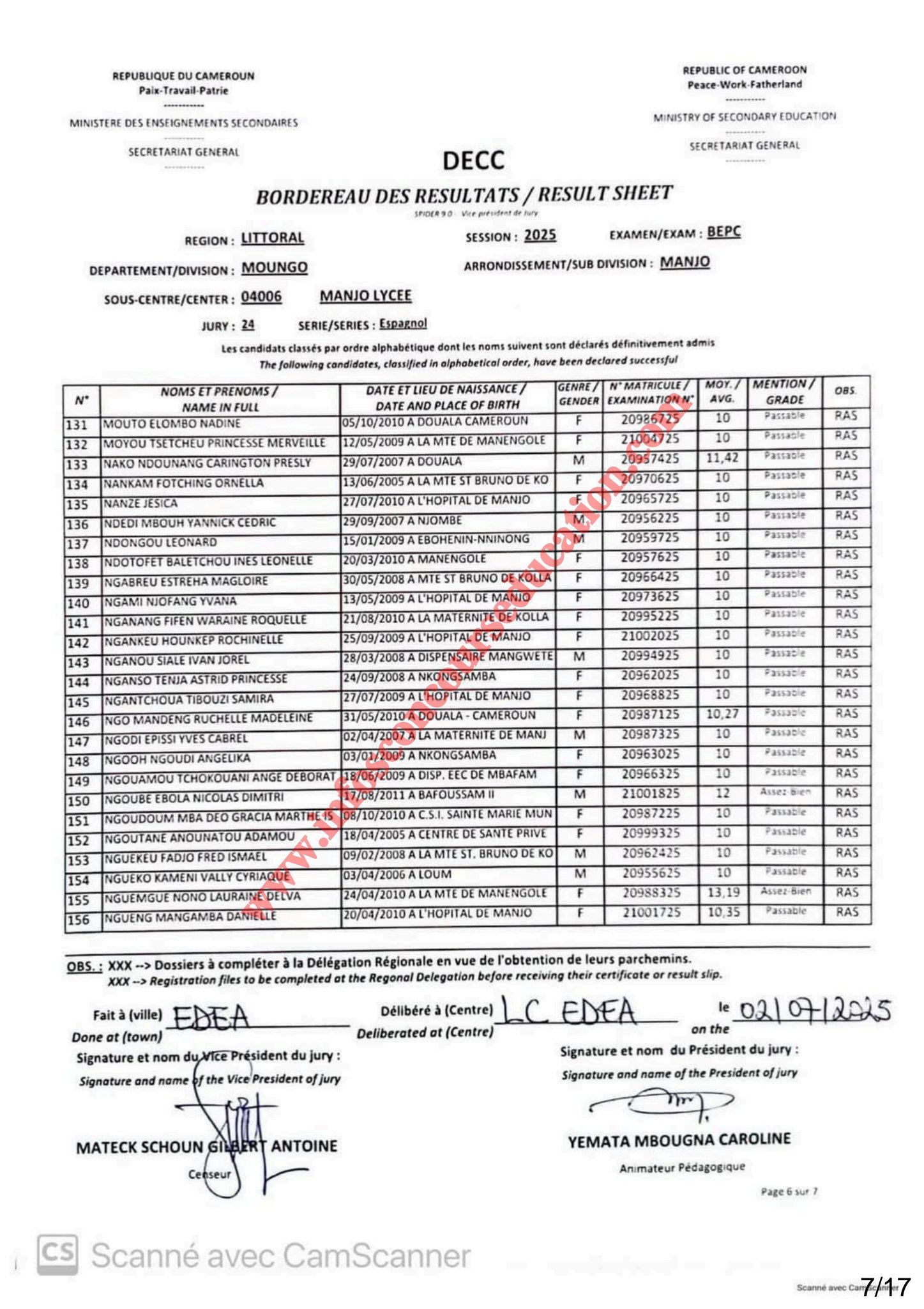 Résultats BEPC 2025 lycée de Manjo
