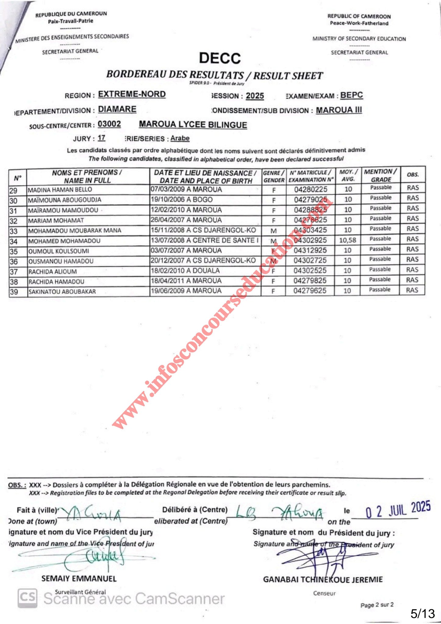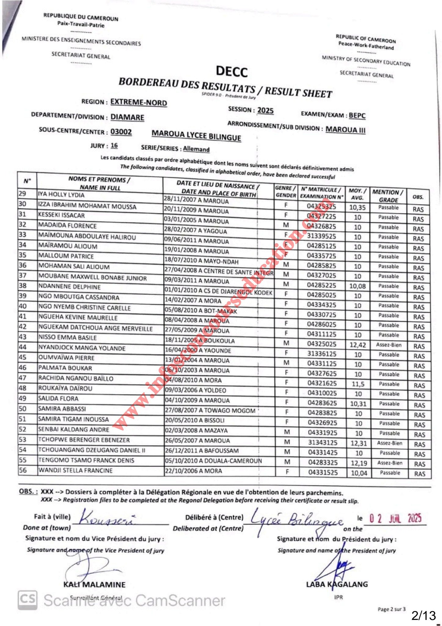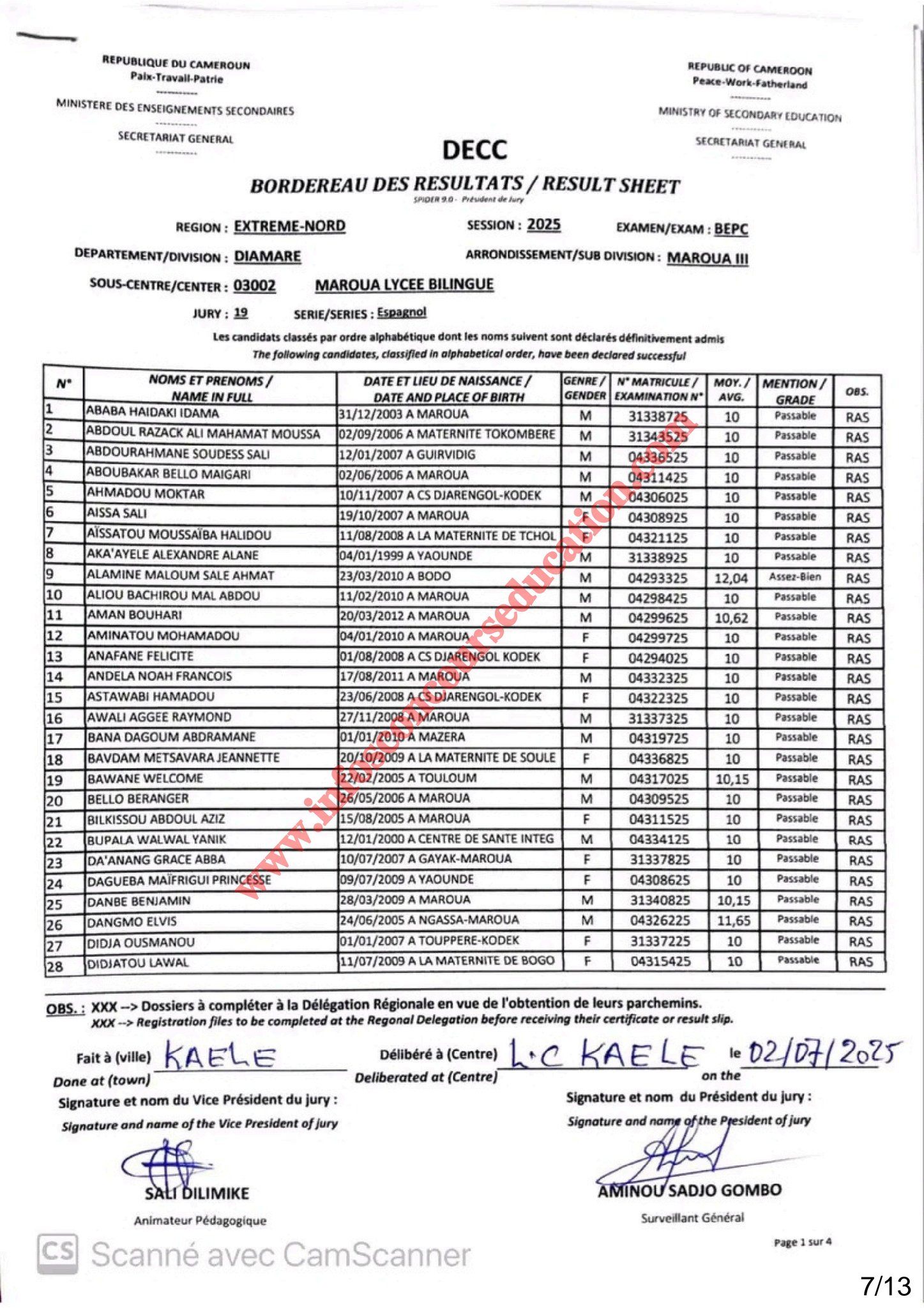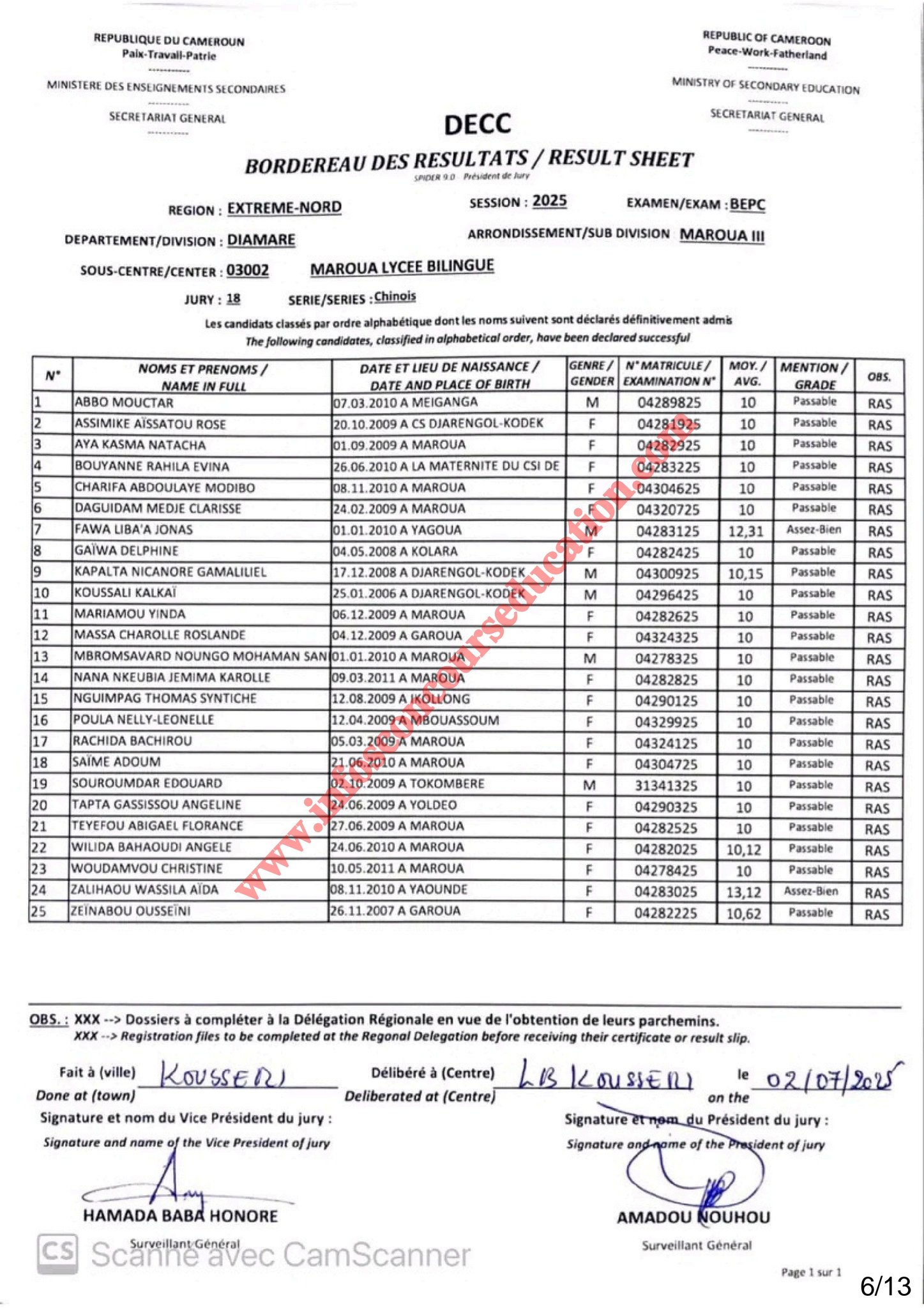 Résultats BEPC 2025 Sous-centre lycée bilingue de Maroua