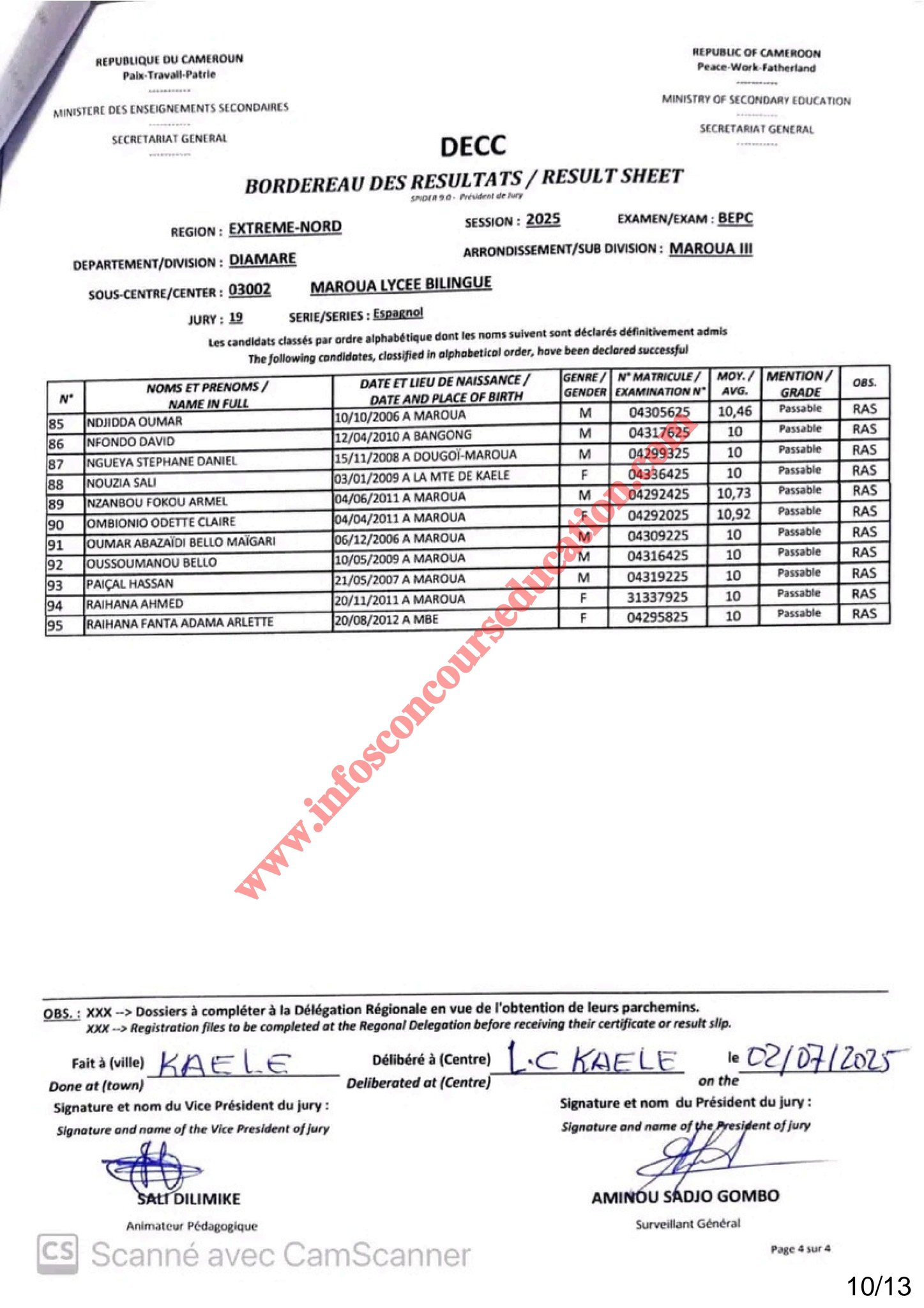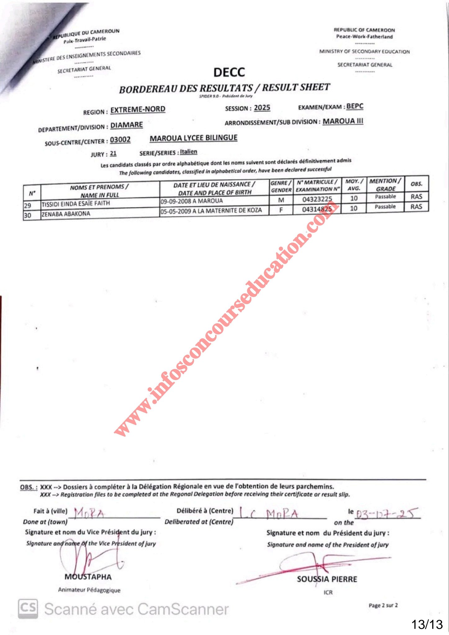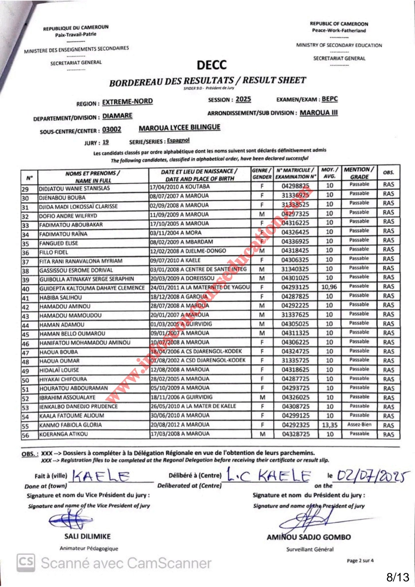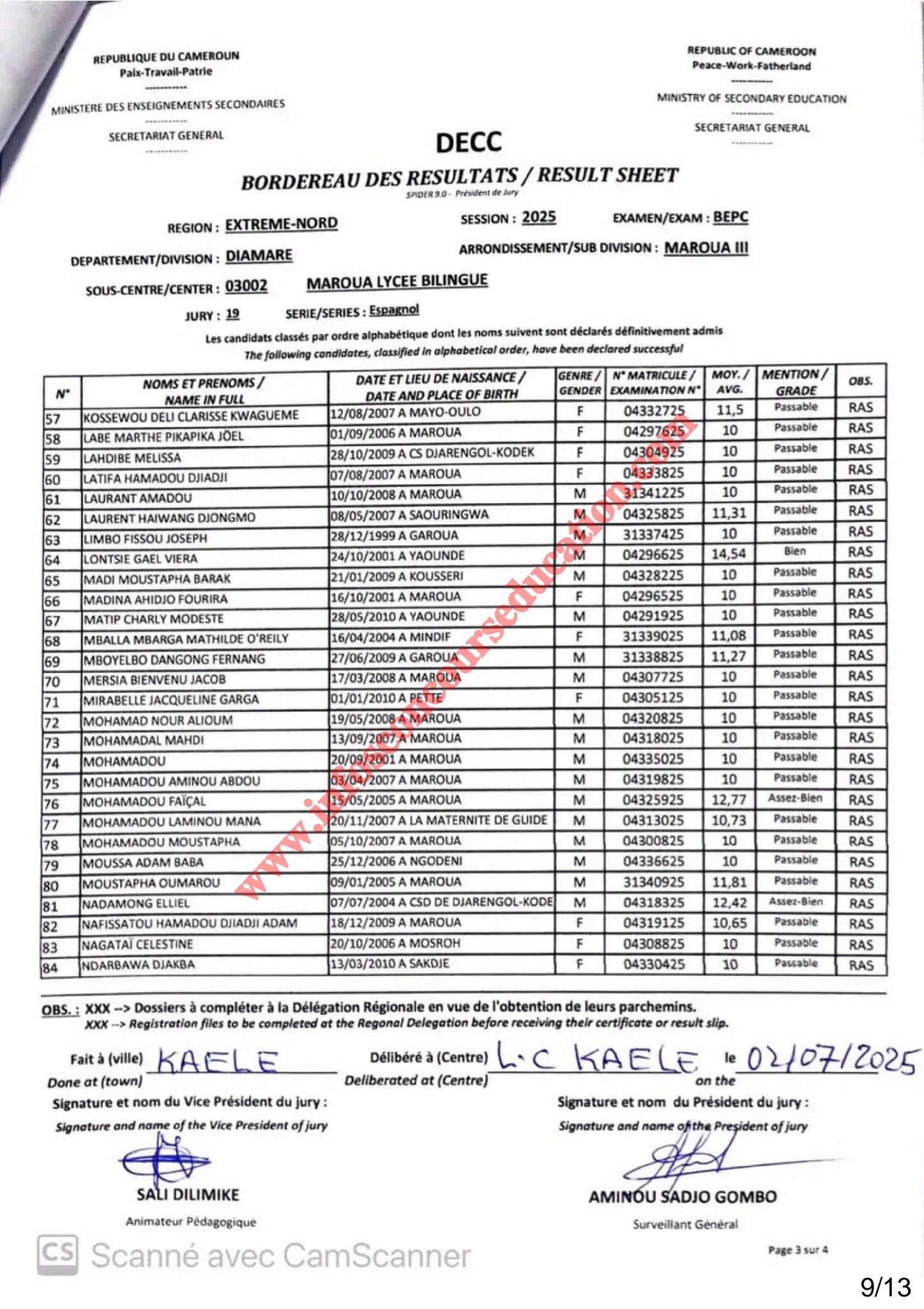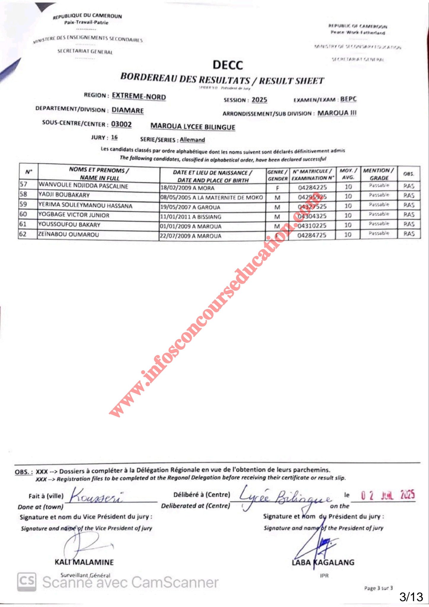 Résultats BEPC 2025 Sous-centre lycée bilingue de Maroua