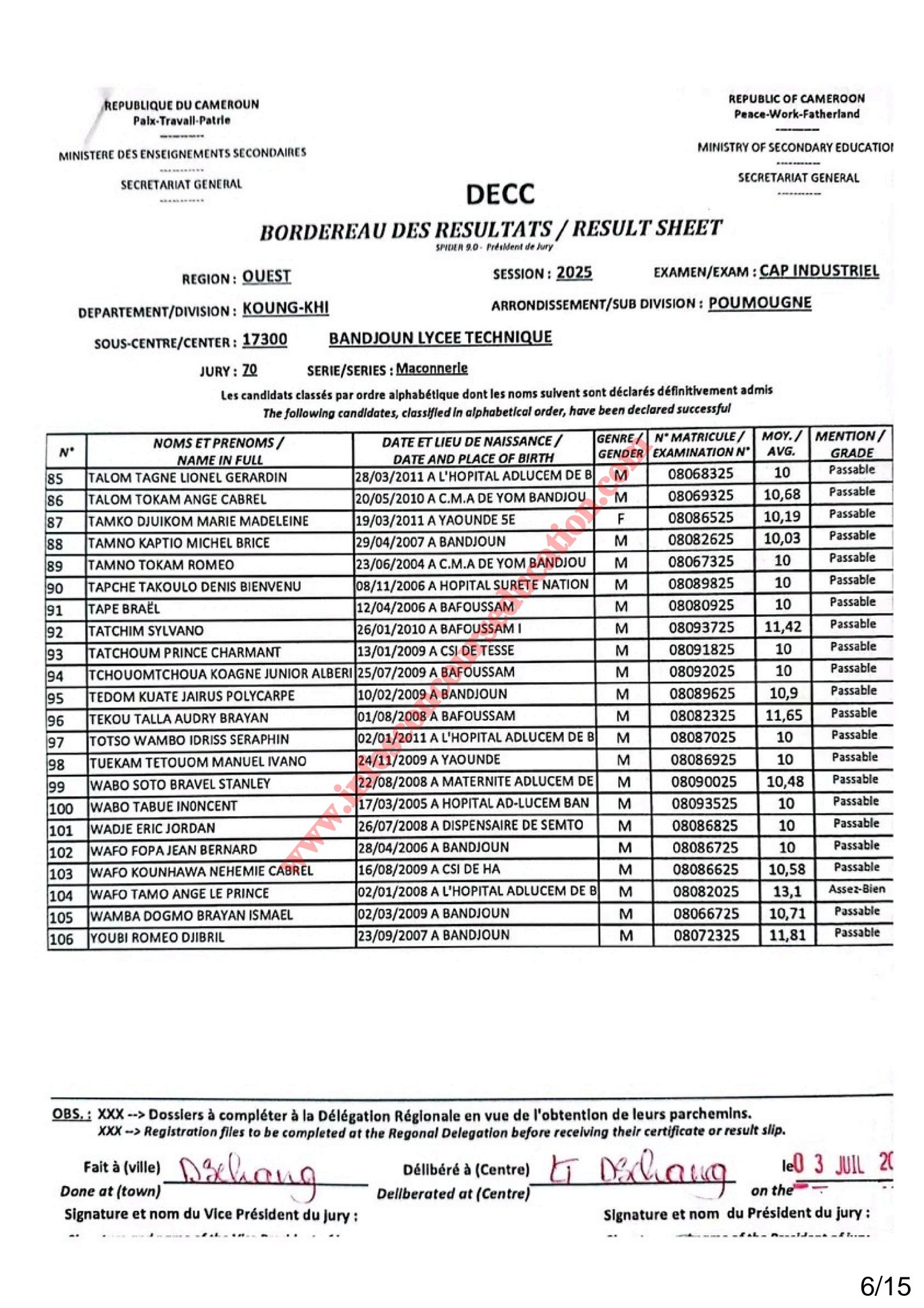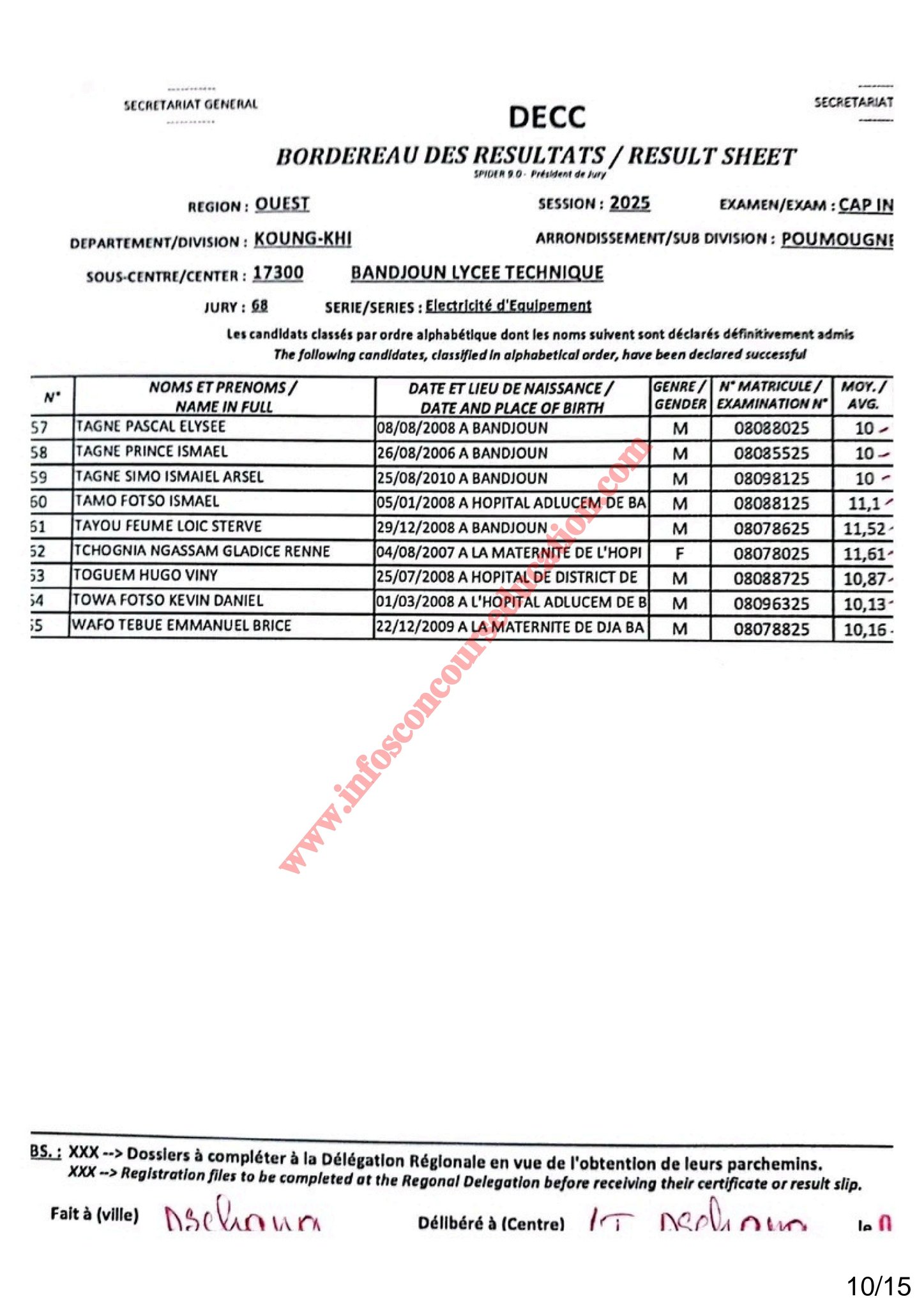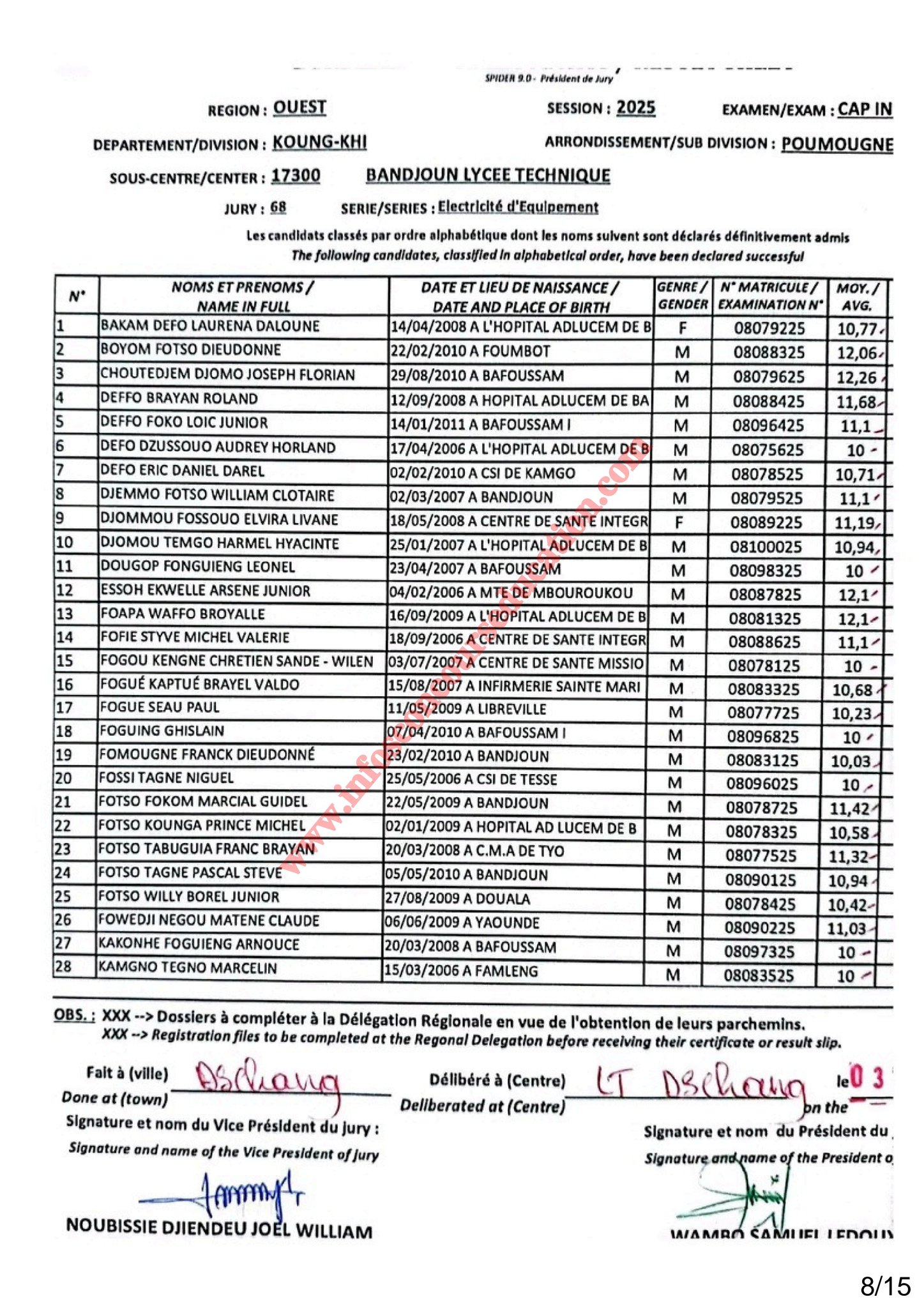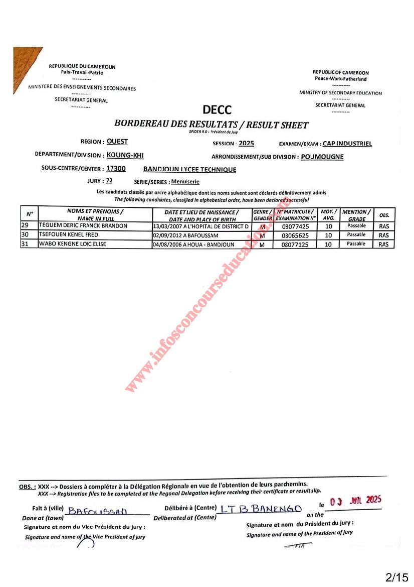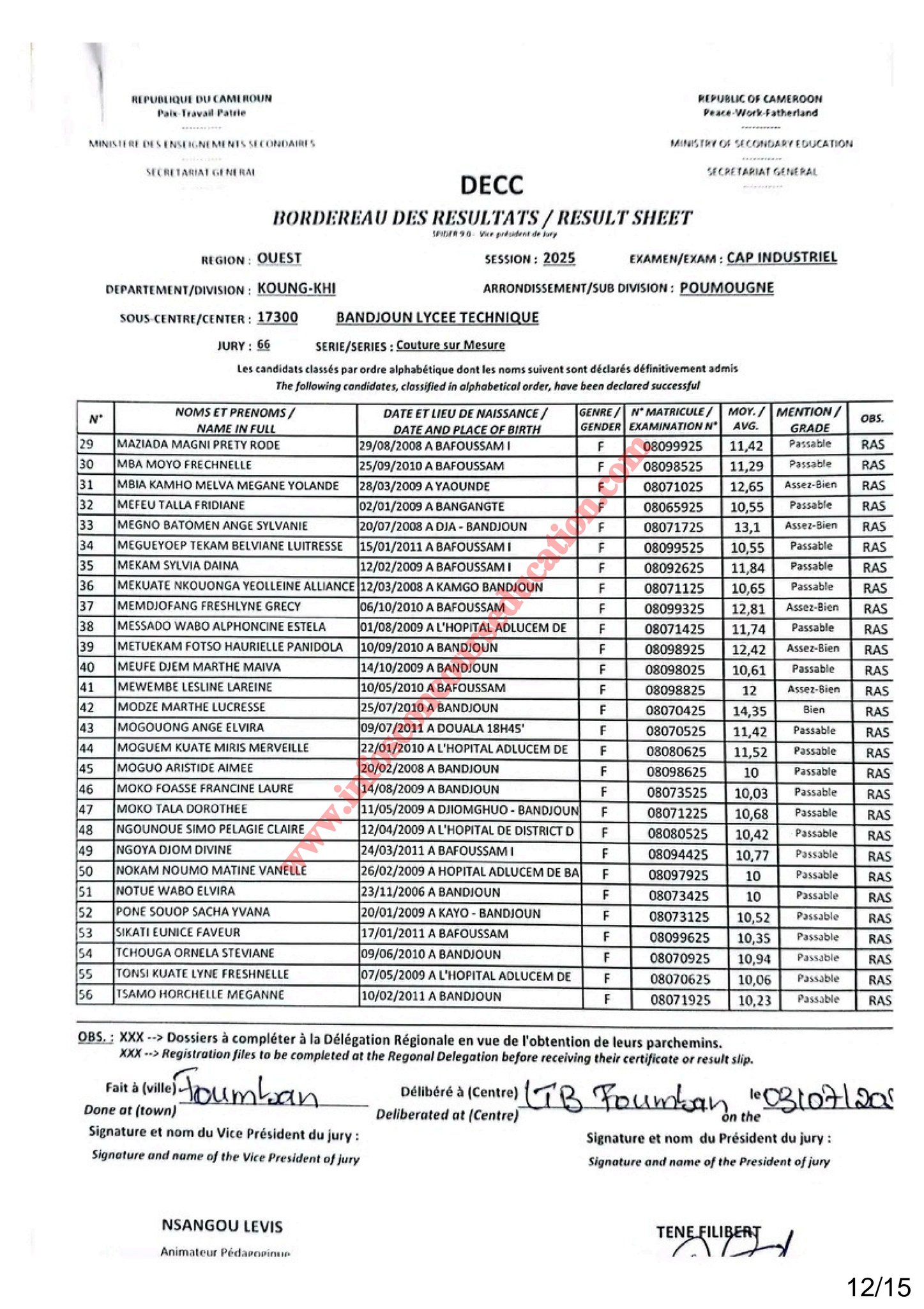 RÉSULTATS CAP INDUSTRIEL 2025 Sous-centre du Lycée Techniquede Bandjoun