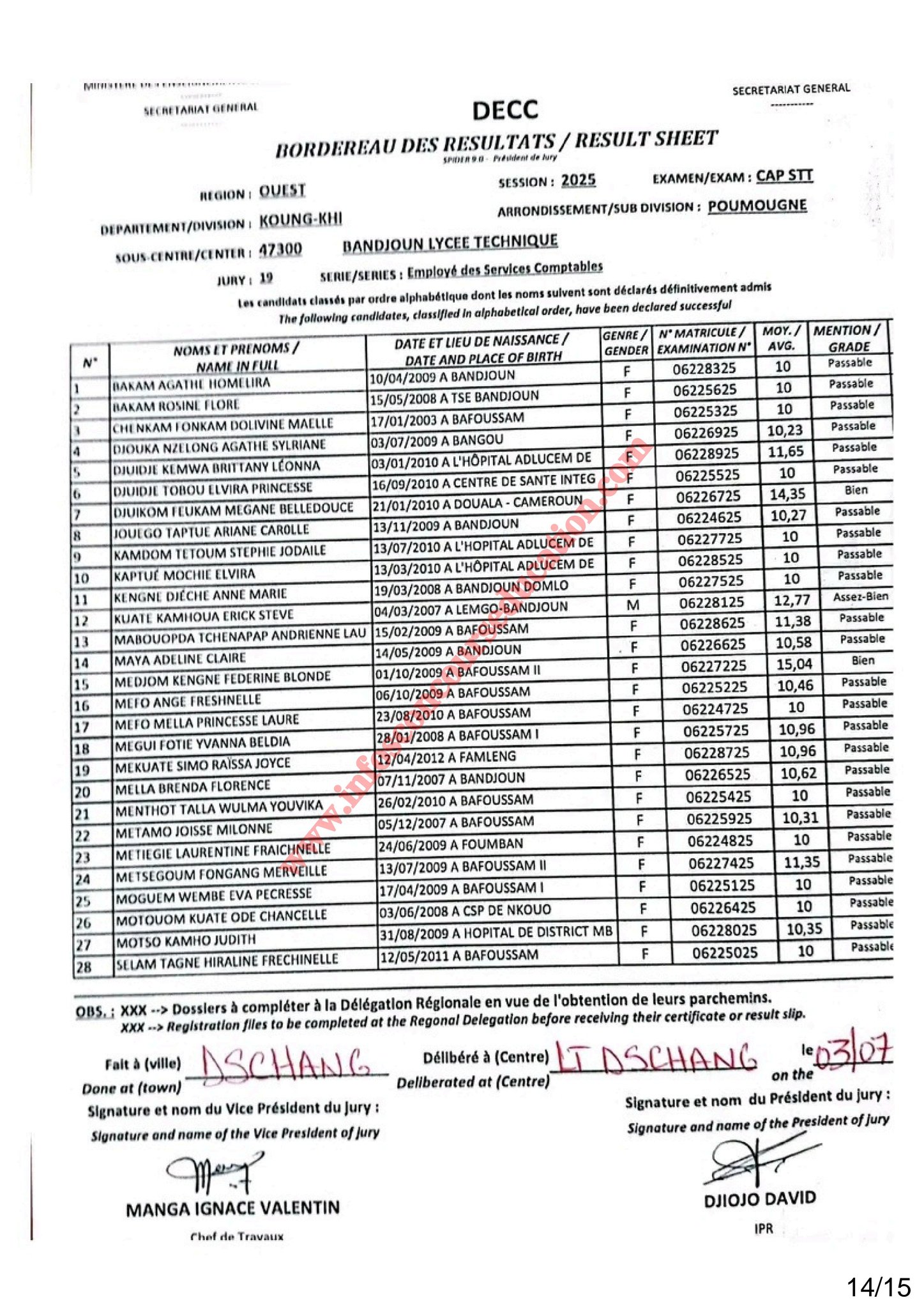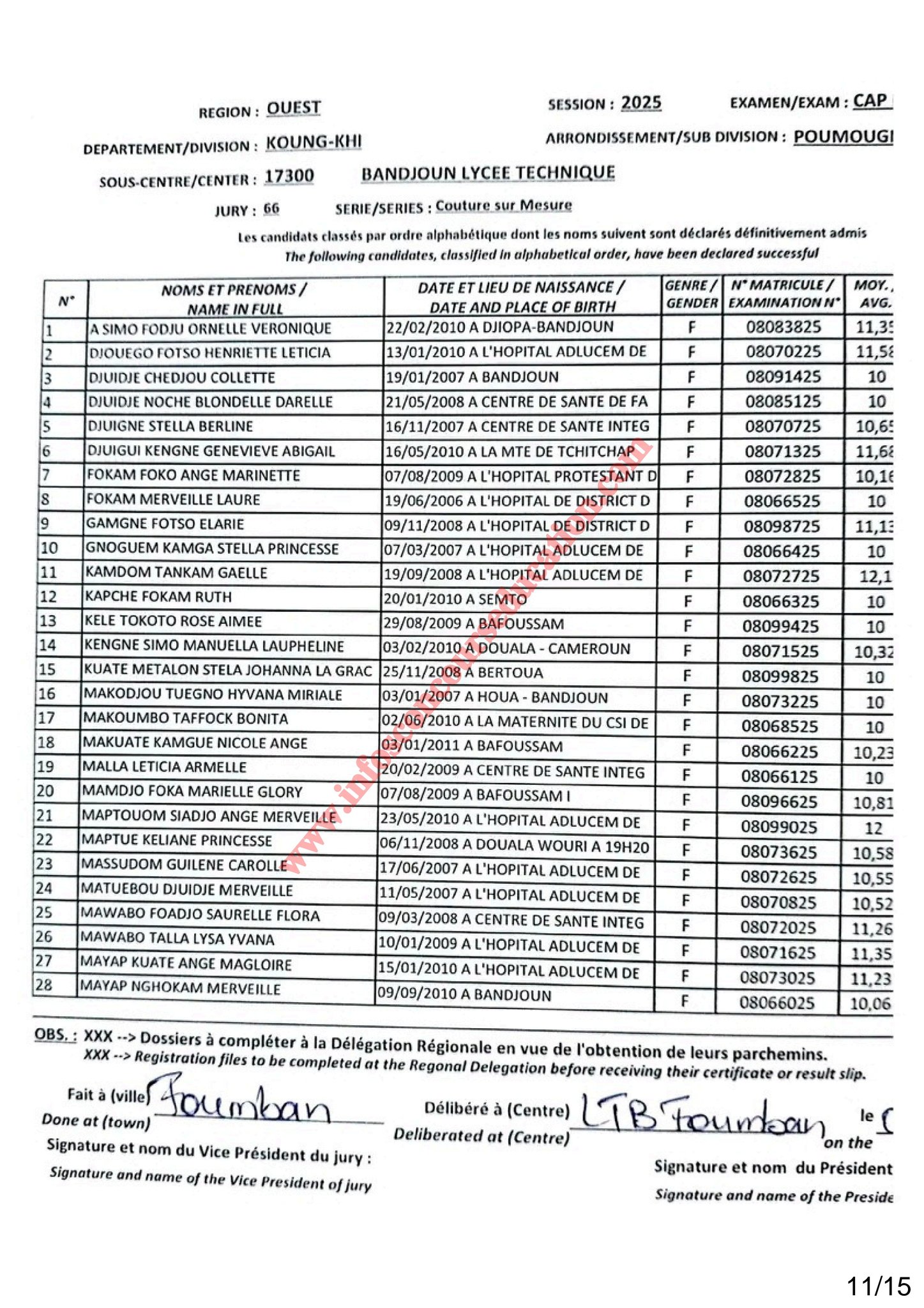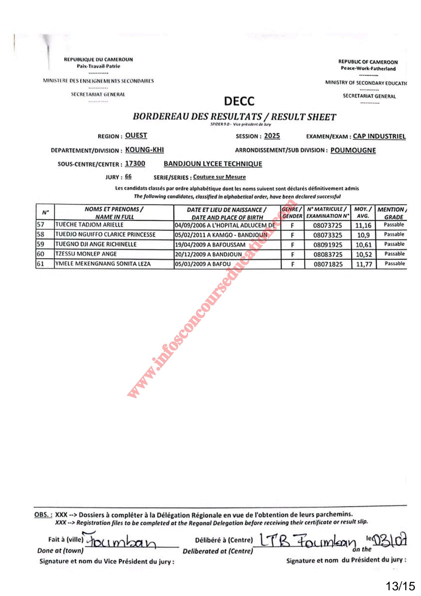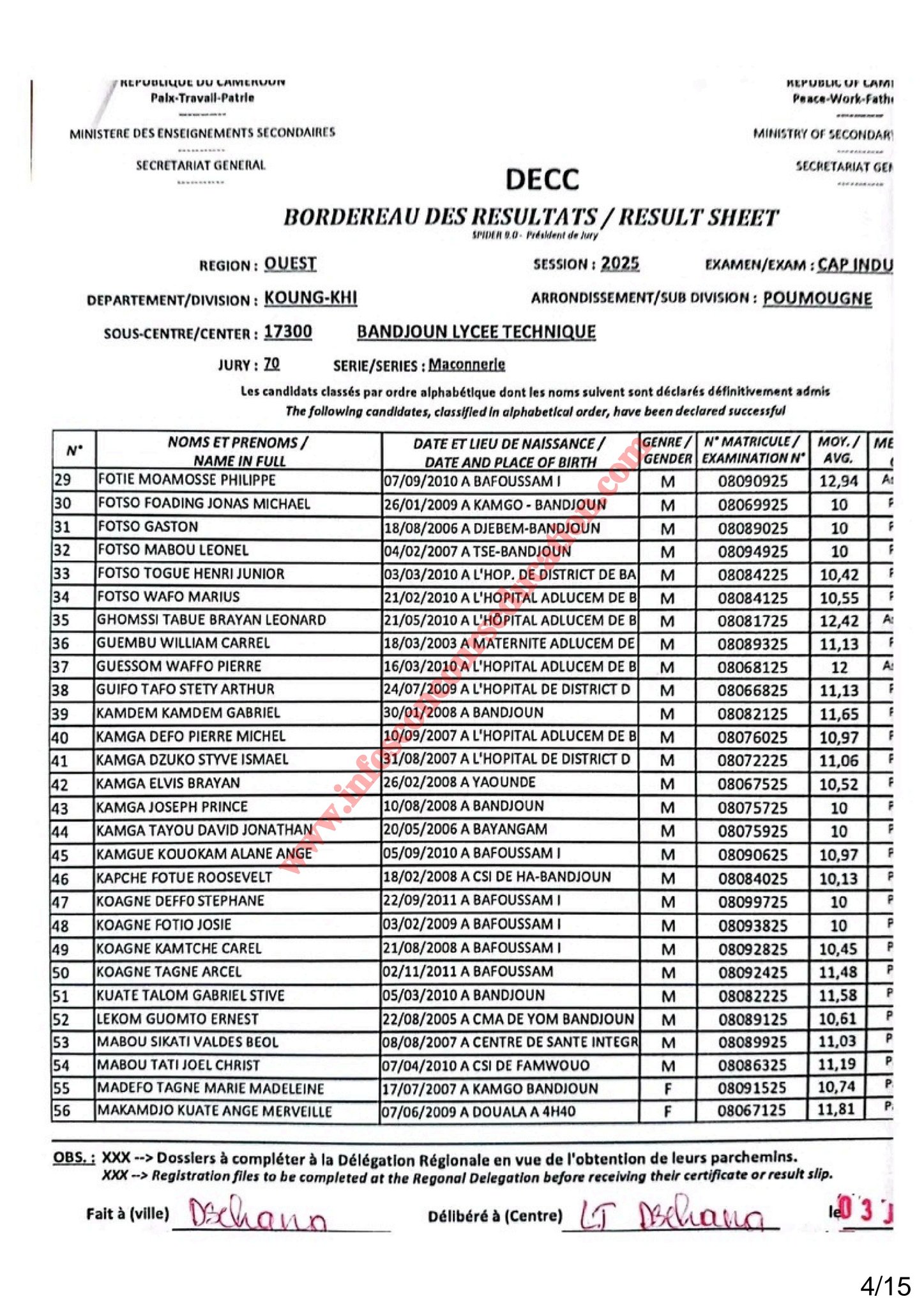 RÉSULTATS CAP INDUSTRIEL 2025 Sous-centre du Lycée Techniquede Bandjoun
