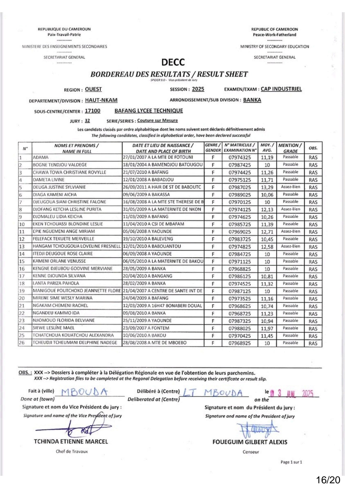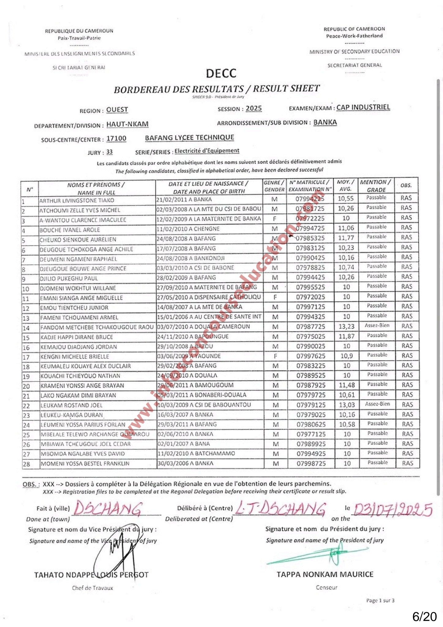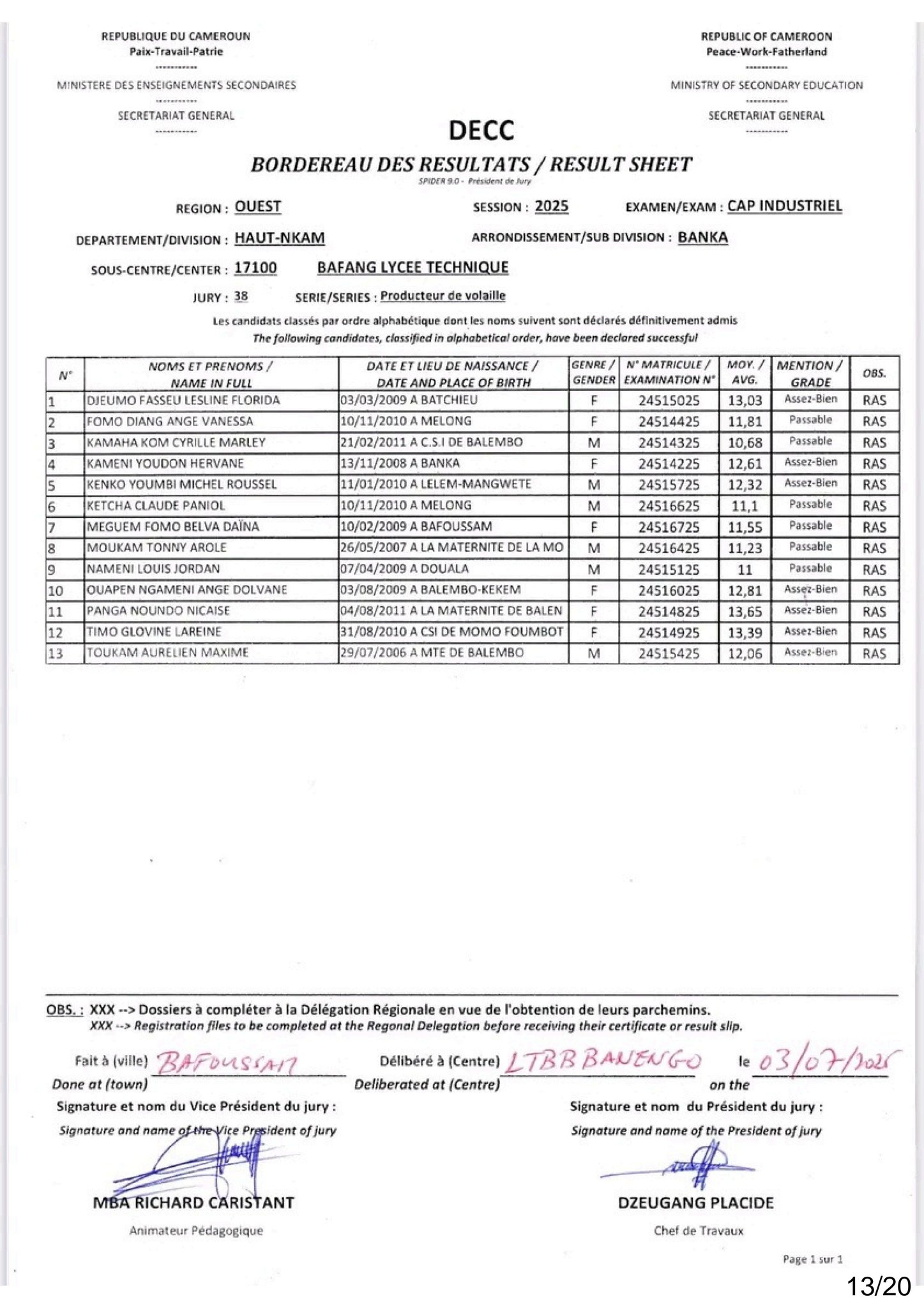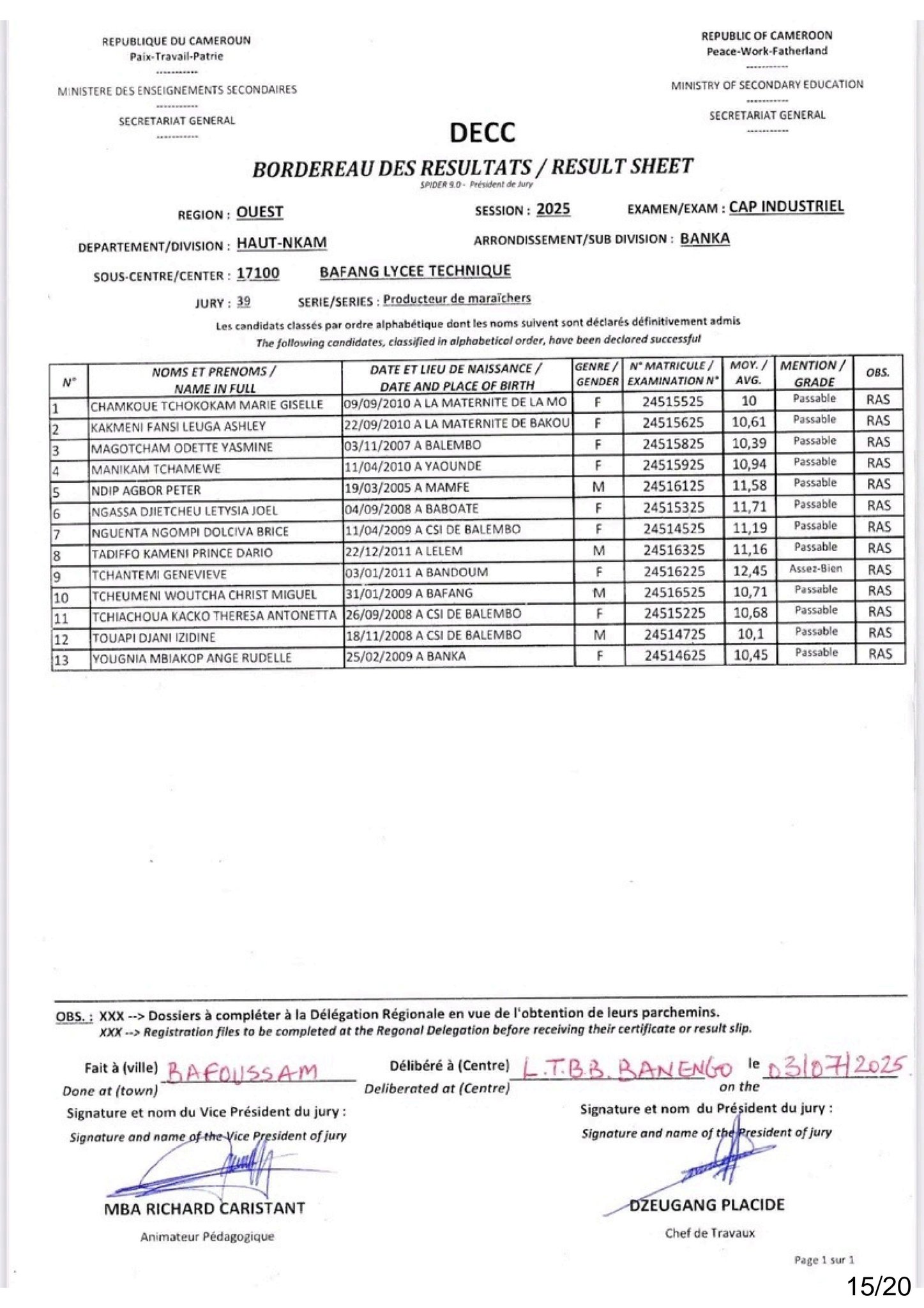 Résultats CAP IND & STT 2025 Sous-centre du Lycée Technique de Bafang