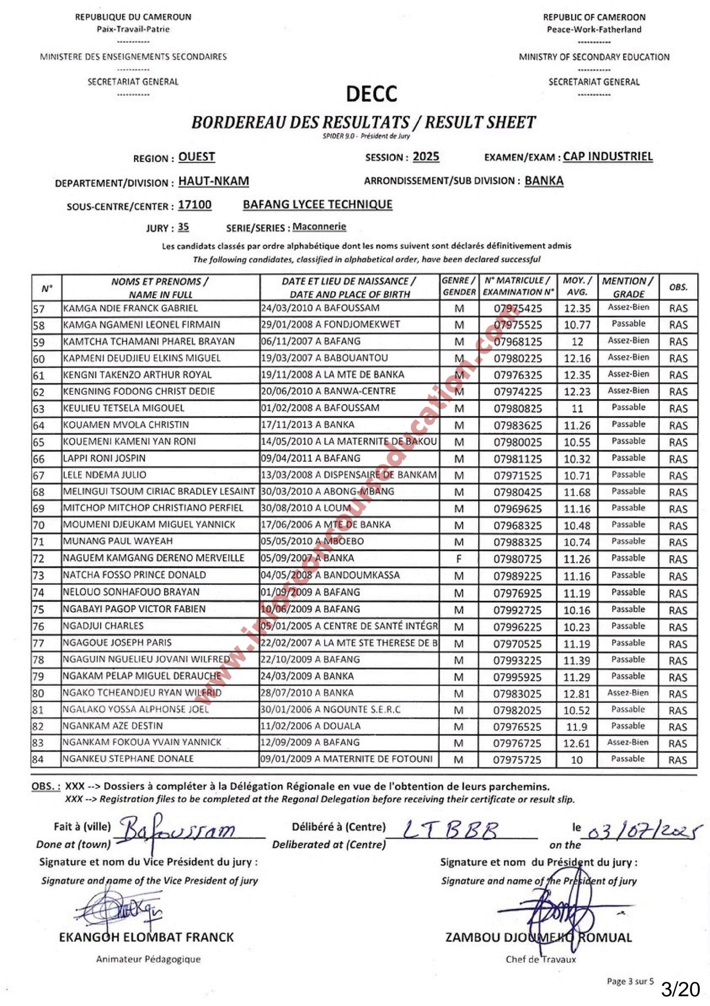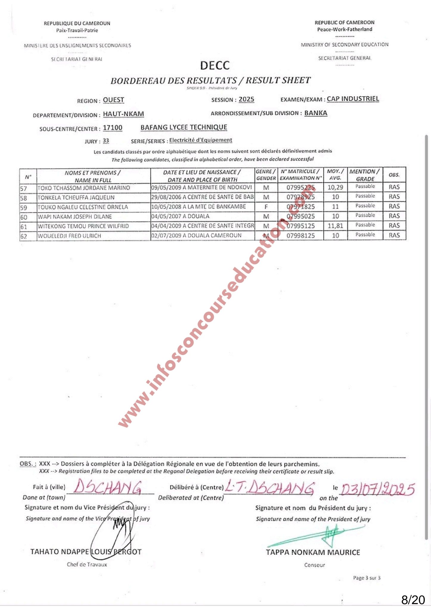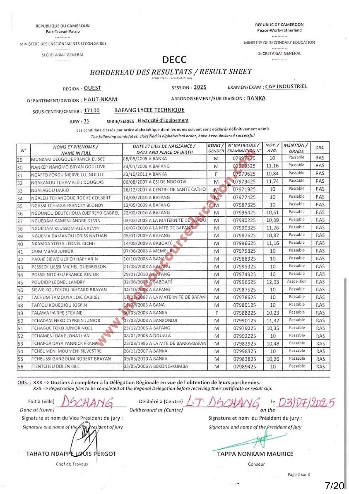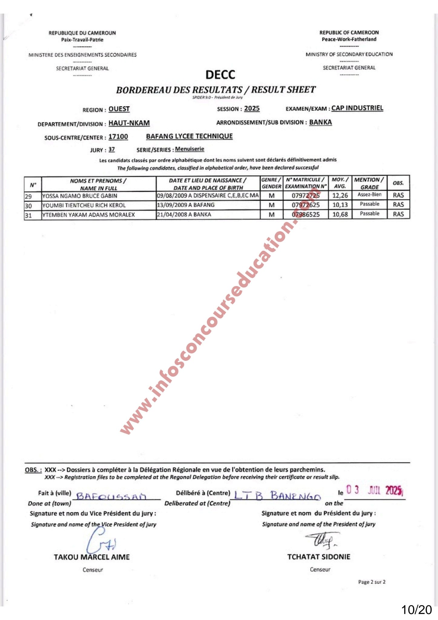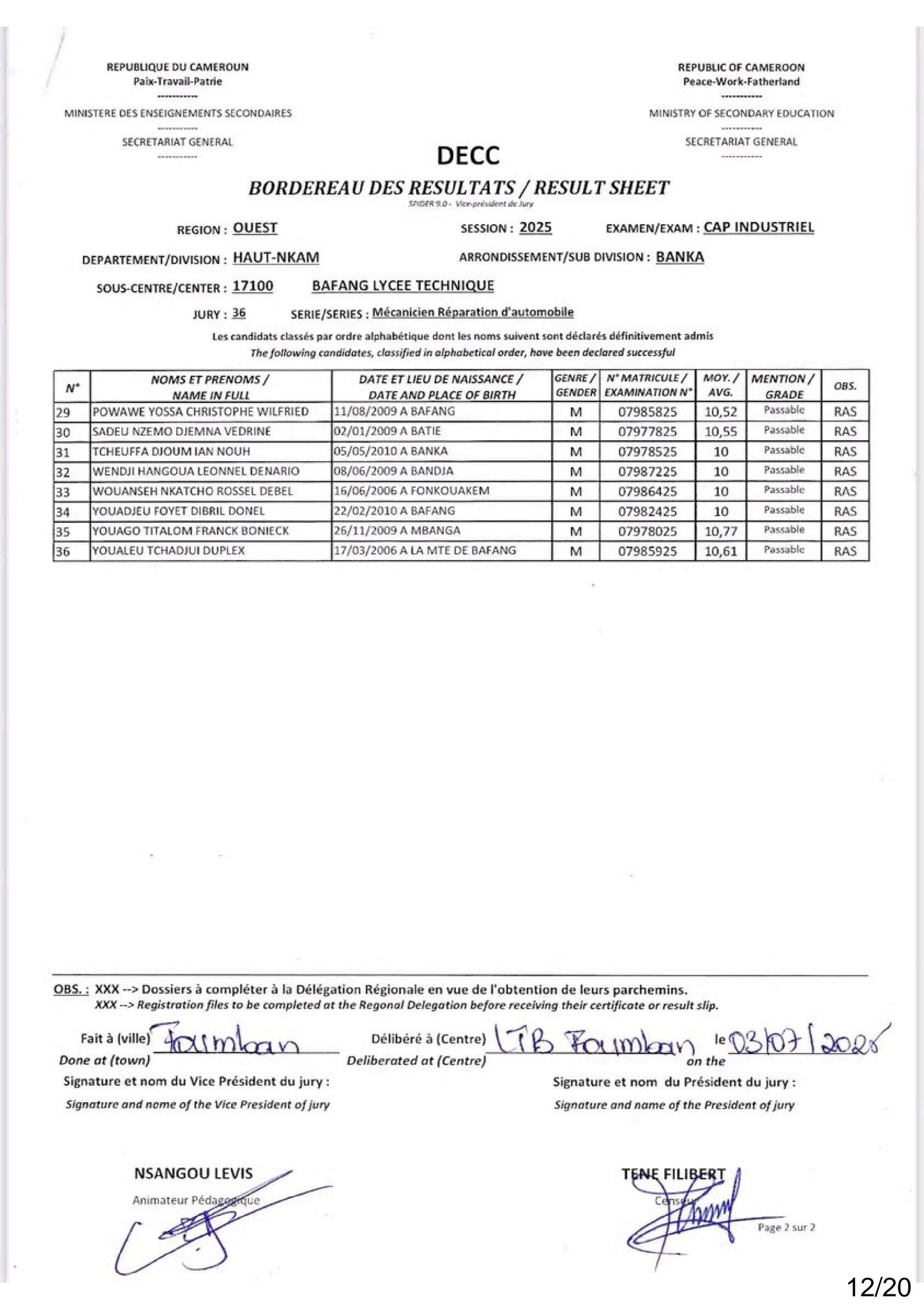 Résultats CAP IND & STT 2025 Sous-centre du Lycée Technique de Bafang