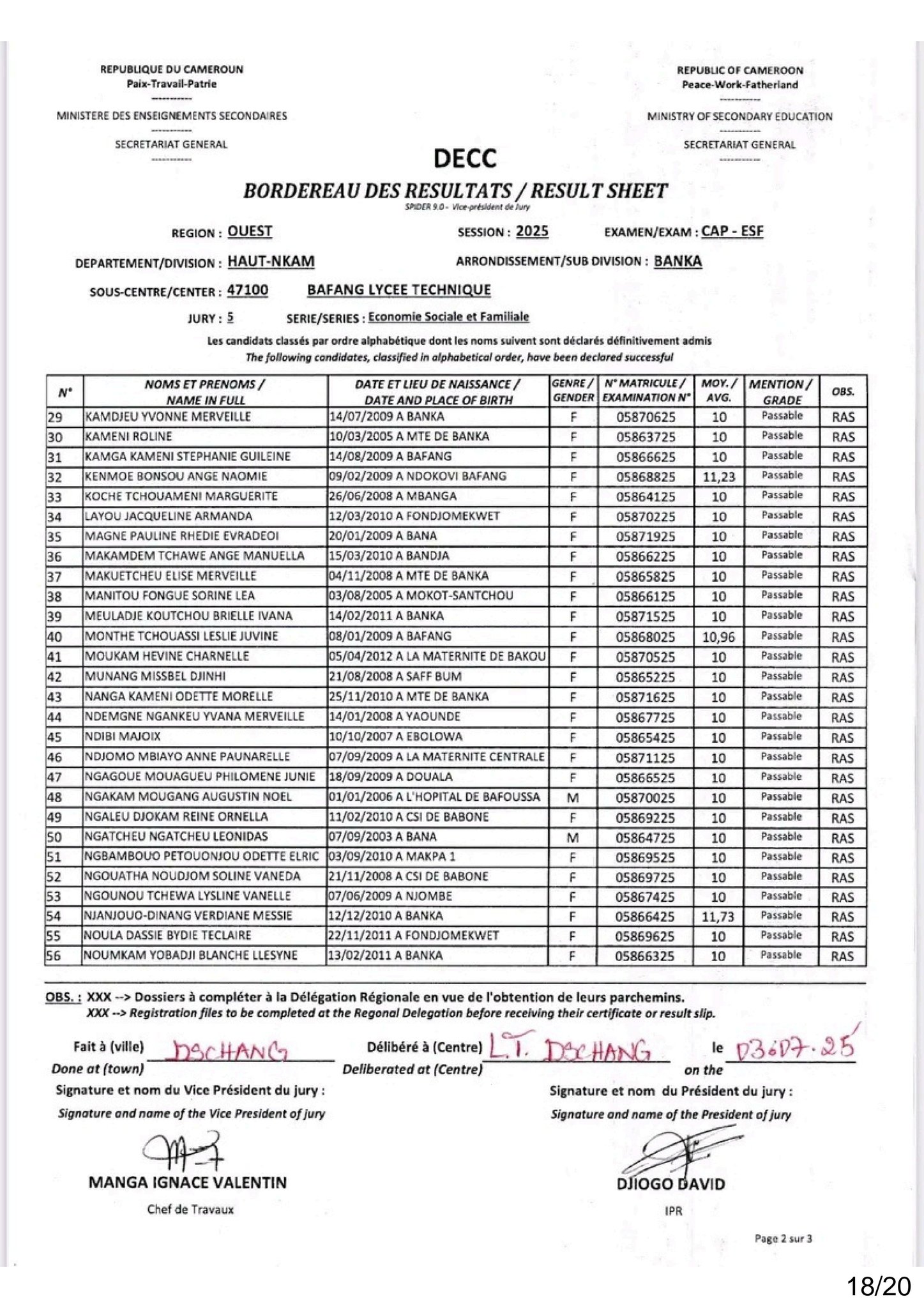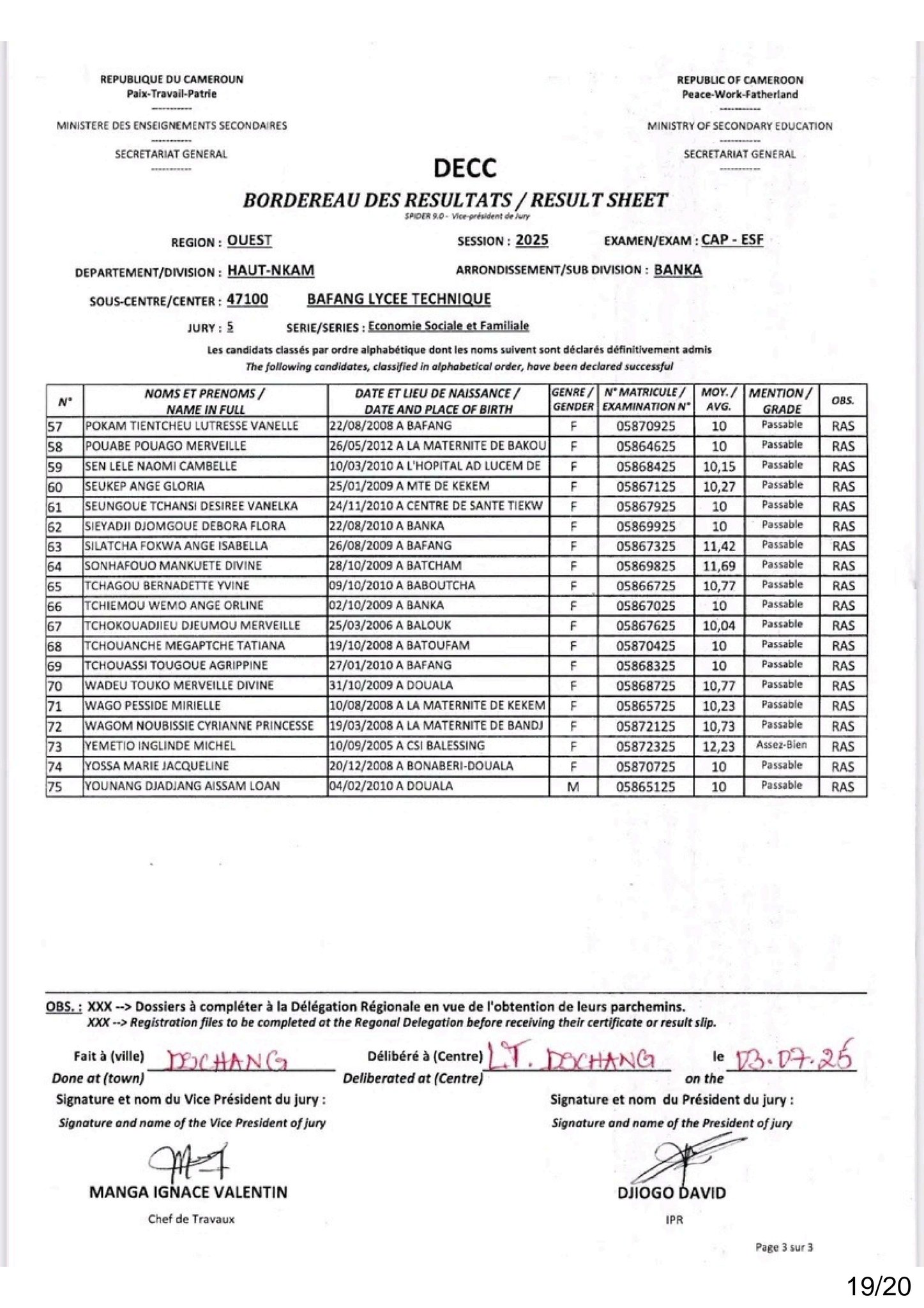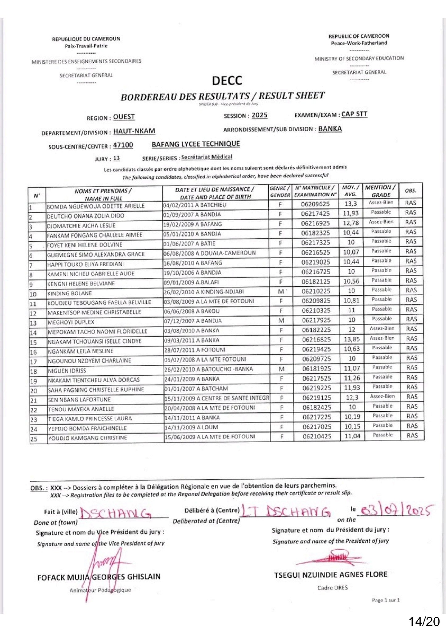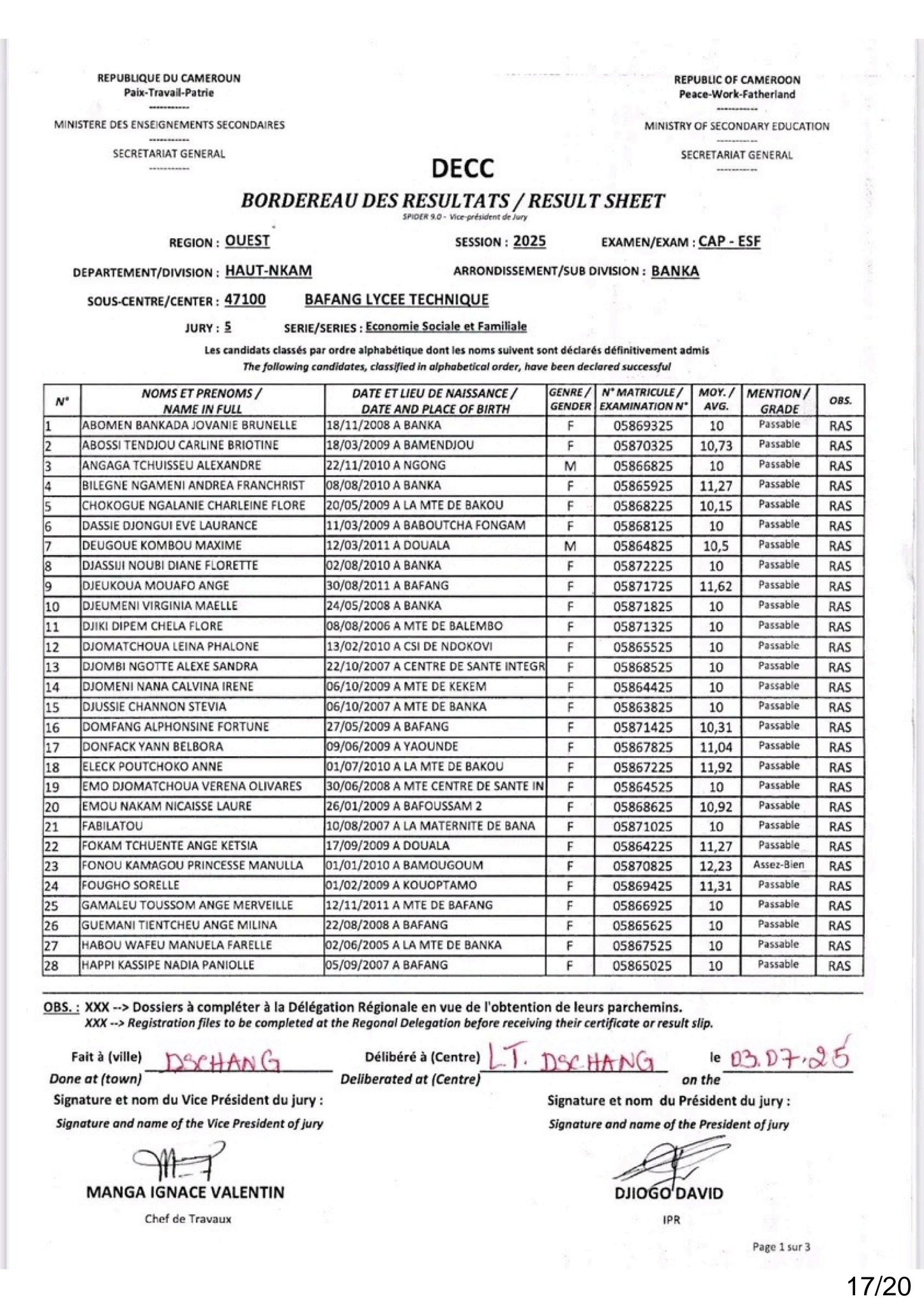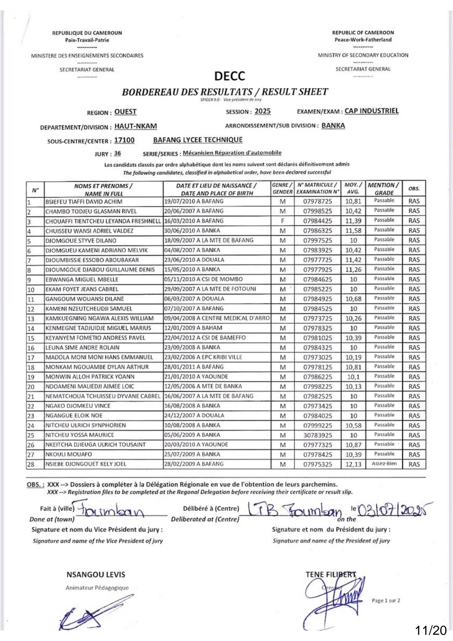 Les résultats du CAP Industriel et STT 2025 pour le sous‑centre du lycée technique de Bafang sont désormais disponibles. Les futurs diplômés et leurs familles sont invités à consulter les listes affichées pour vérifier leur réussite, reflet de la qualité de la formation et de l’investissement de chacun tout au long de l’année.