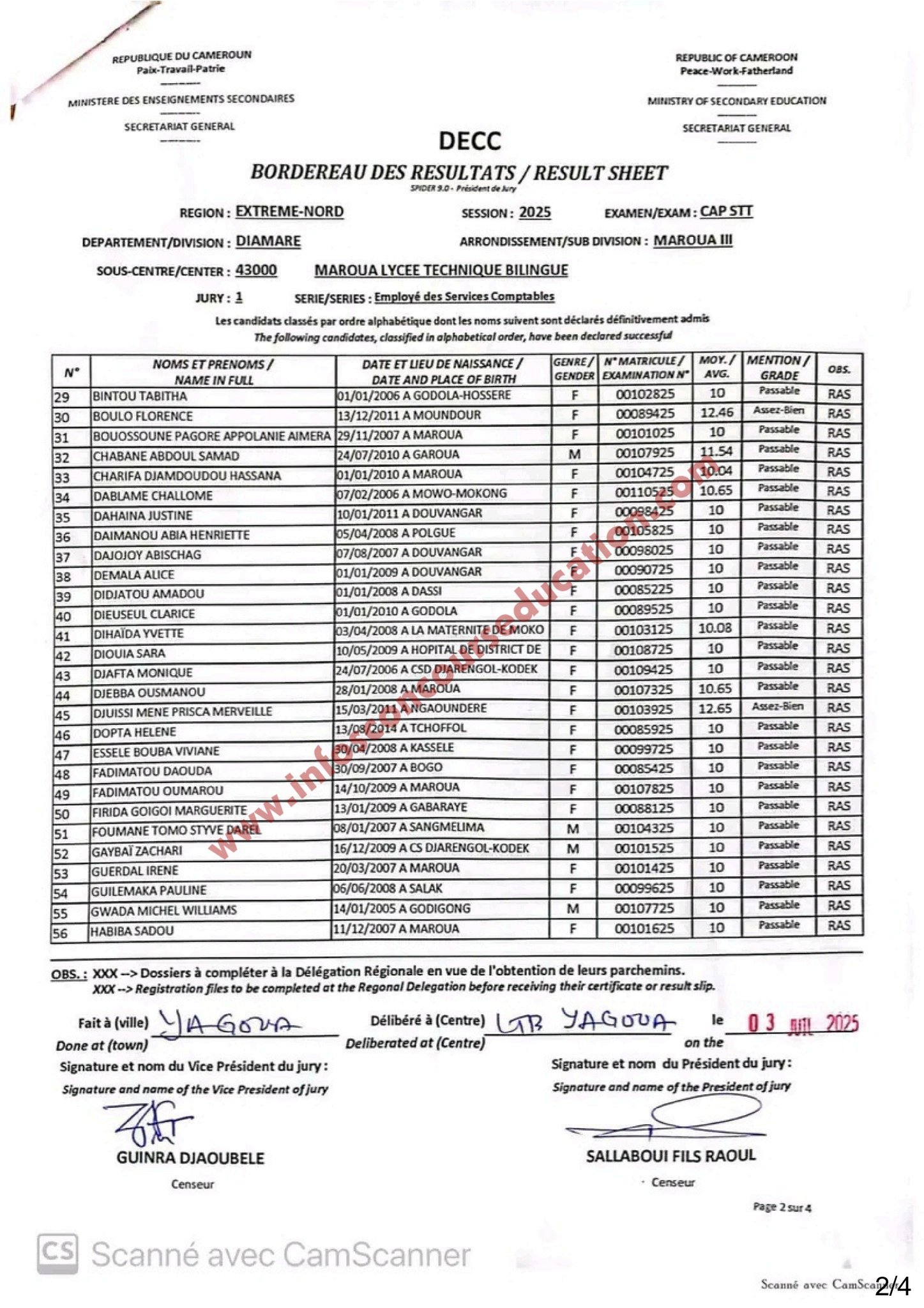 Résultats CAP STT 2025 lycée technique bilingue de MAROUA